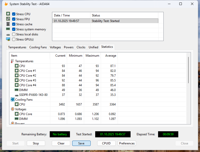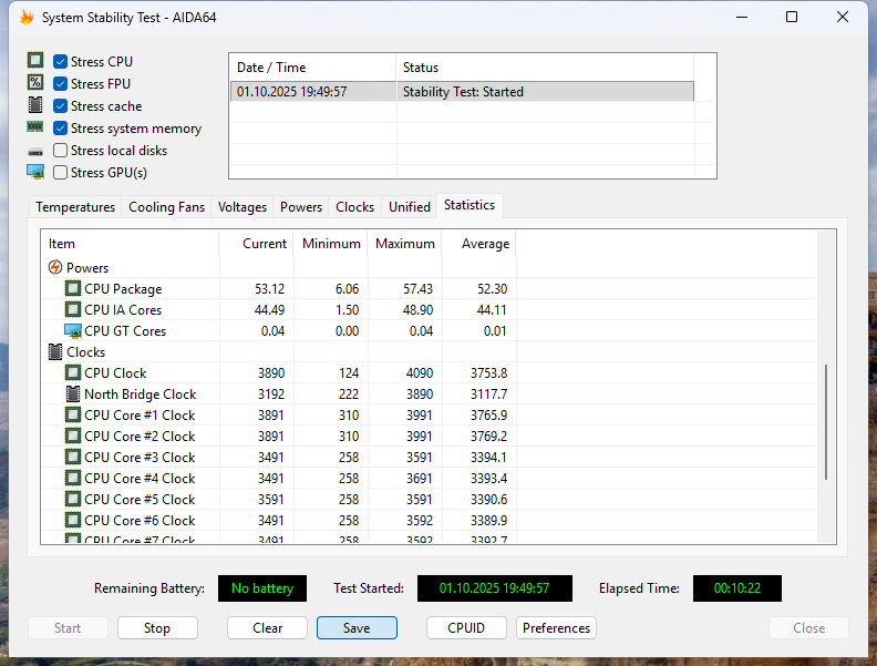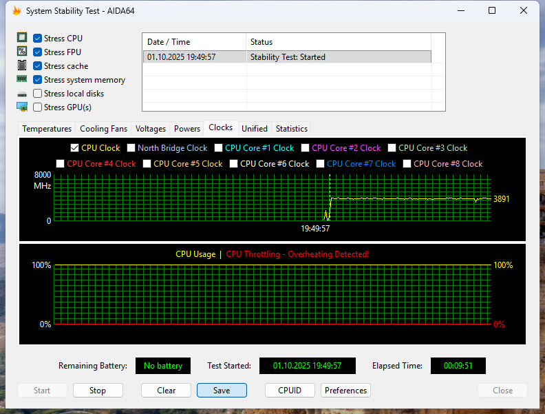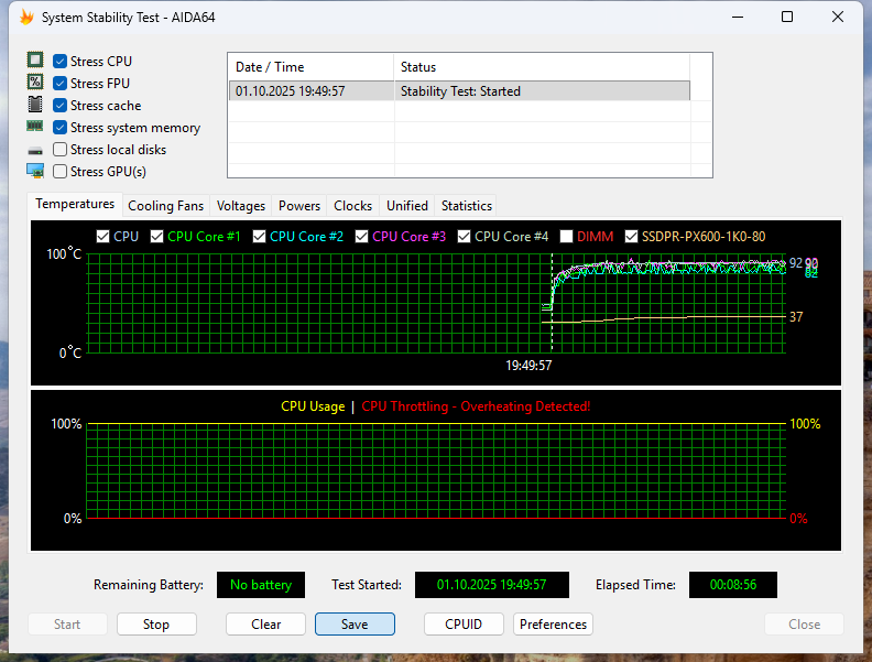 В оценке эффективности системы охлаждения ASUS NUC 15 Pro помогла утилита AIDA64 System Stability Test. Тестирование проводилось в режим работы системы охлаждения Standard.