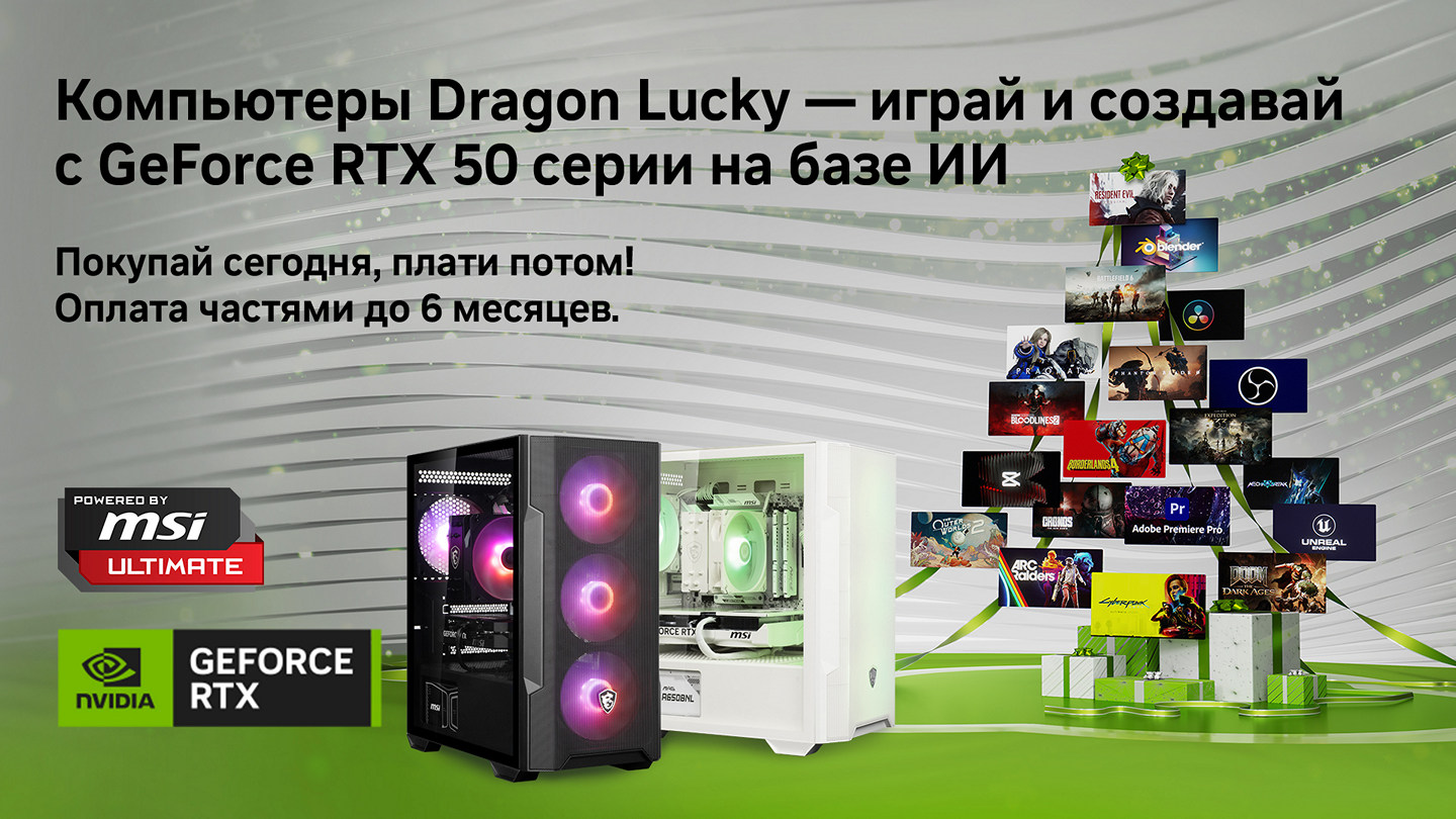 Если любите игры и хотите чем-то порадовать себя в преддверии зимних праздников, то компьютеры Dragon Lucky с видеокартами NVIDIA справятся с такой задачей и станут хорошим подарком. Серия GeForce RTX 50 сейчас является лучшим выбором для геймера, предлагая оптимальный баланс возможностей и полную поддержку всех передовых технологий NVIDIA. А Dragon Lucky предлагают широкий выбор конфигураций разного уровня с различными вариантами видеокарт серии GeForce RTX 50. Покупая такой ПК, вы сразу получаете систему с компонентами от одного производителя, где будет гарантирована полная совместимость. Все это уже настроено и правильно работает из коробки. А стоимость таких компьютеров находится на уровне всех компонентов, если их покупать отдельно. В дополнение вы получаете длительную трехлетнюю гарантию и возможность оплаты частями на шесть месяцев.