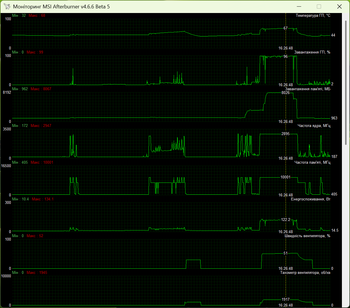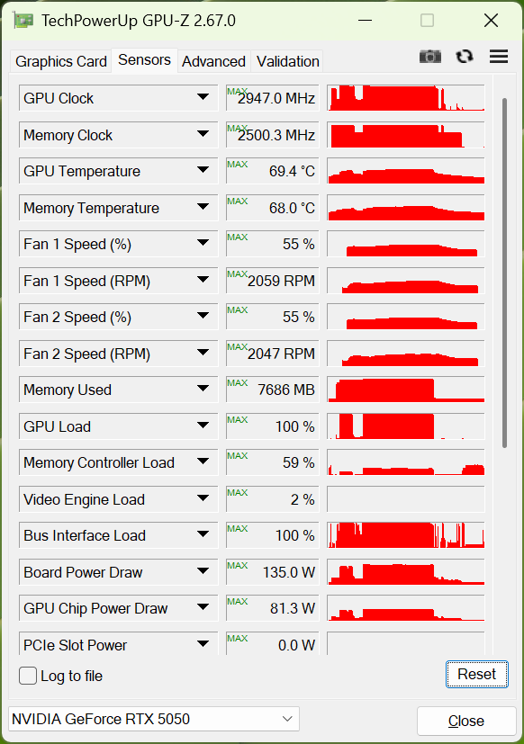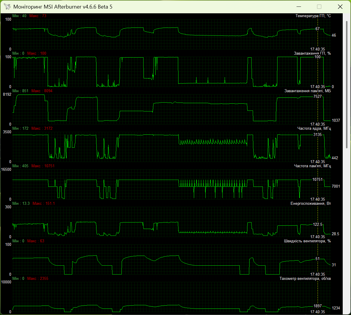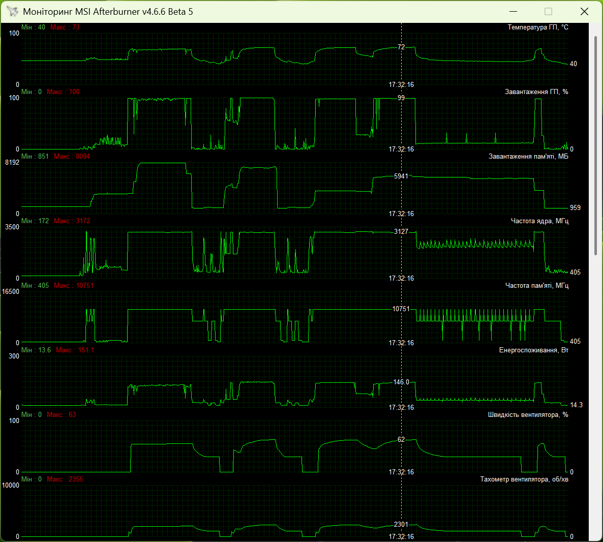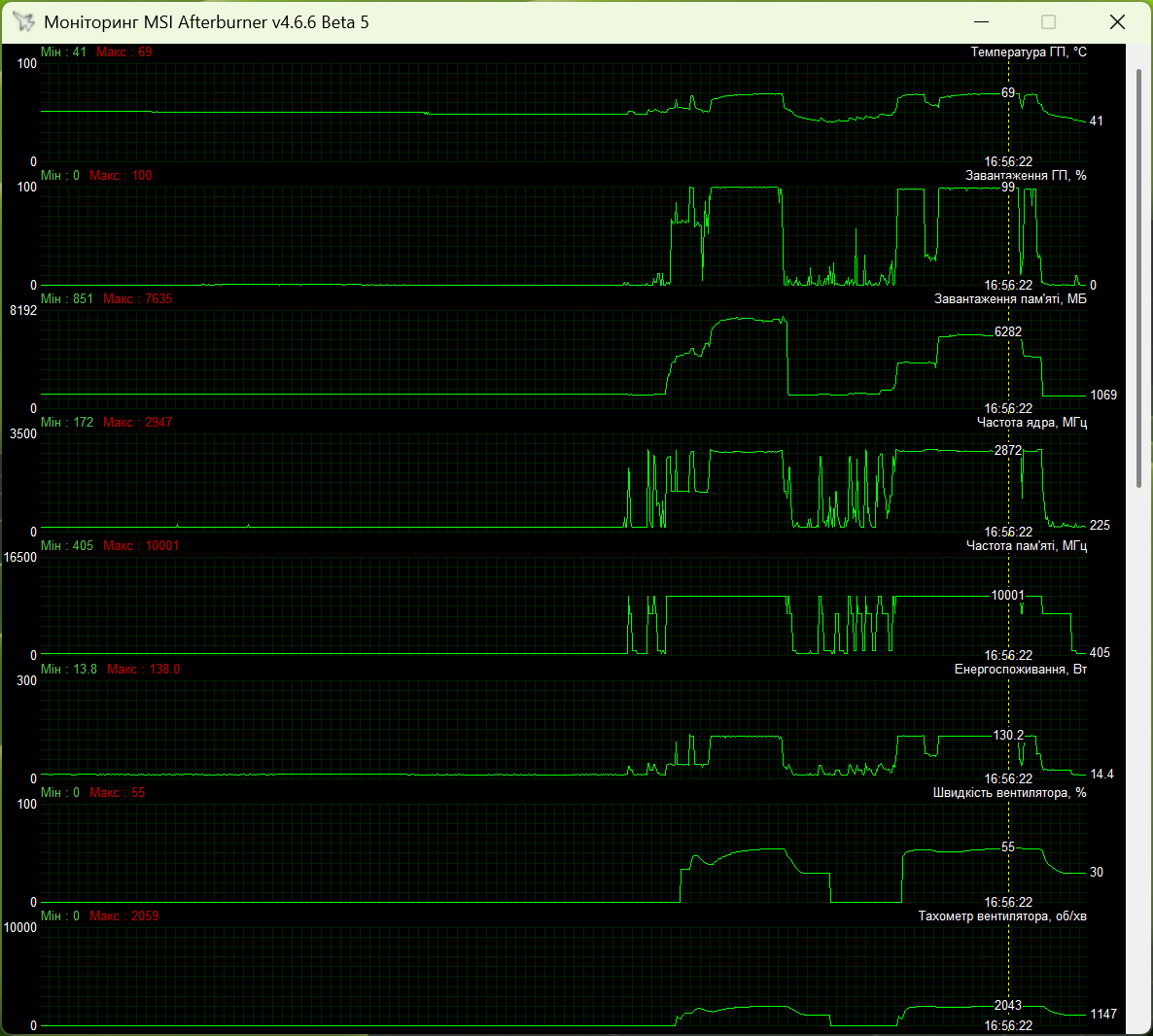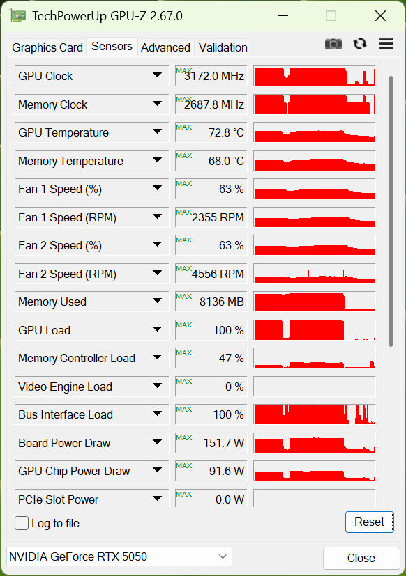 В таком случае чип уже нагрелся до 72,8 градуса, память осталась на том же уровне, а скорость вентиляторов возросла до 2355 об/мин, как и уровень шума — до 46,2 дБ(А).