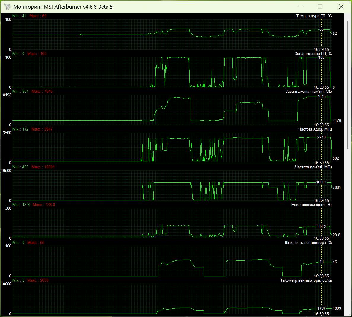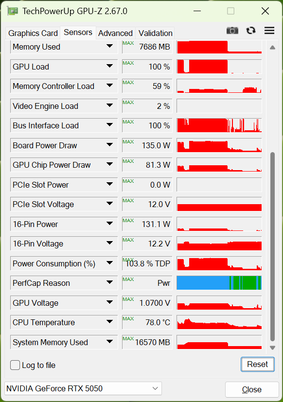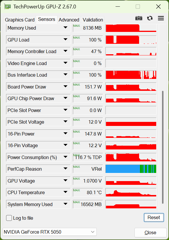 В реальности частота GPU была больше. Например, в Avatar: Frontiers of Pandora она достигала 2836–2850 МГц, в Cyberpunk 2077 — 2857–2872 МГц, в Assassin’s Creed Mirage была на уровне 2887–2895 МГц, а в The Last of Us вообще доходила до 2910 МГц.