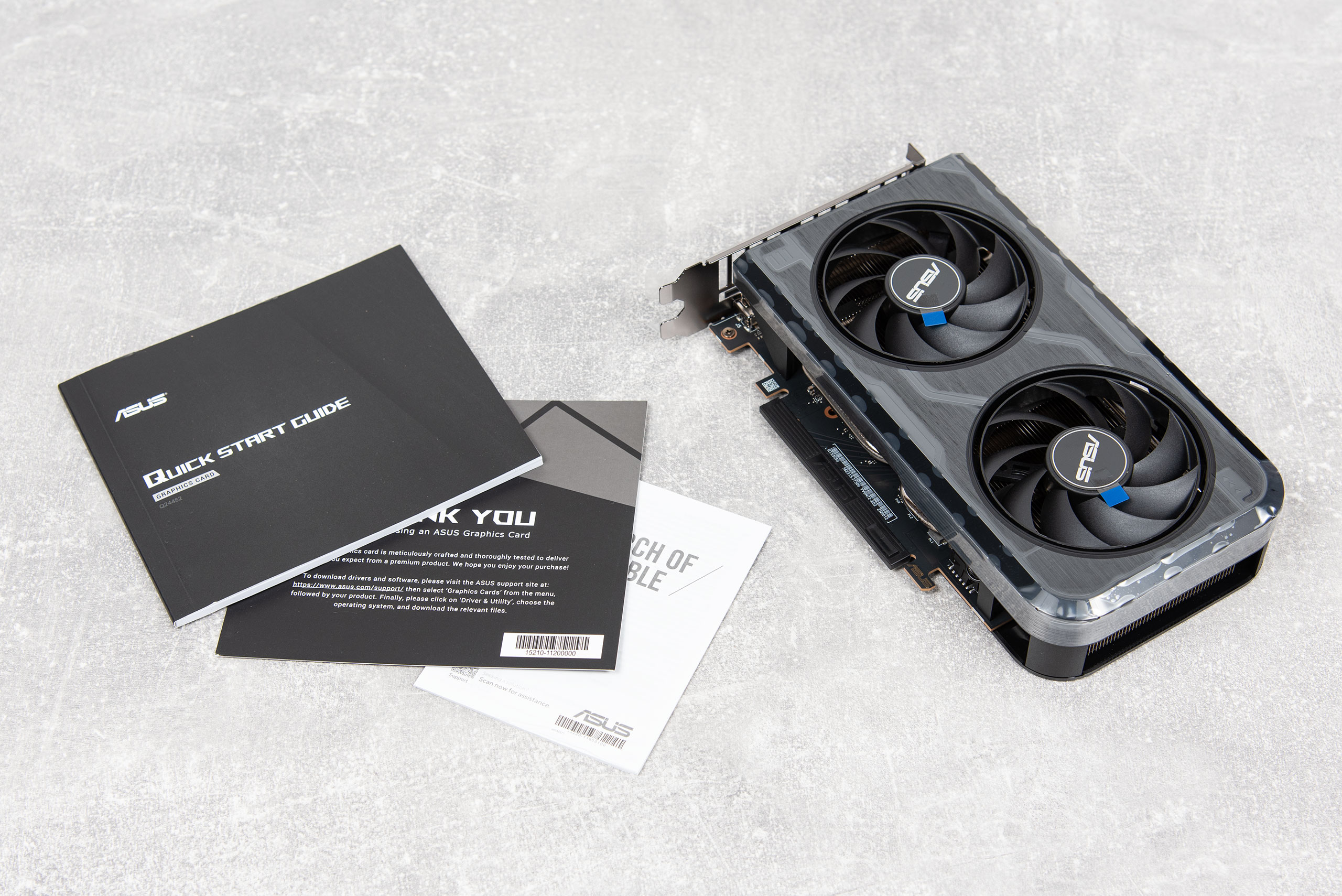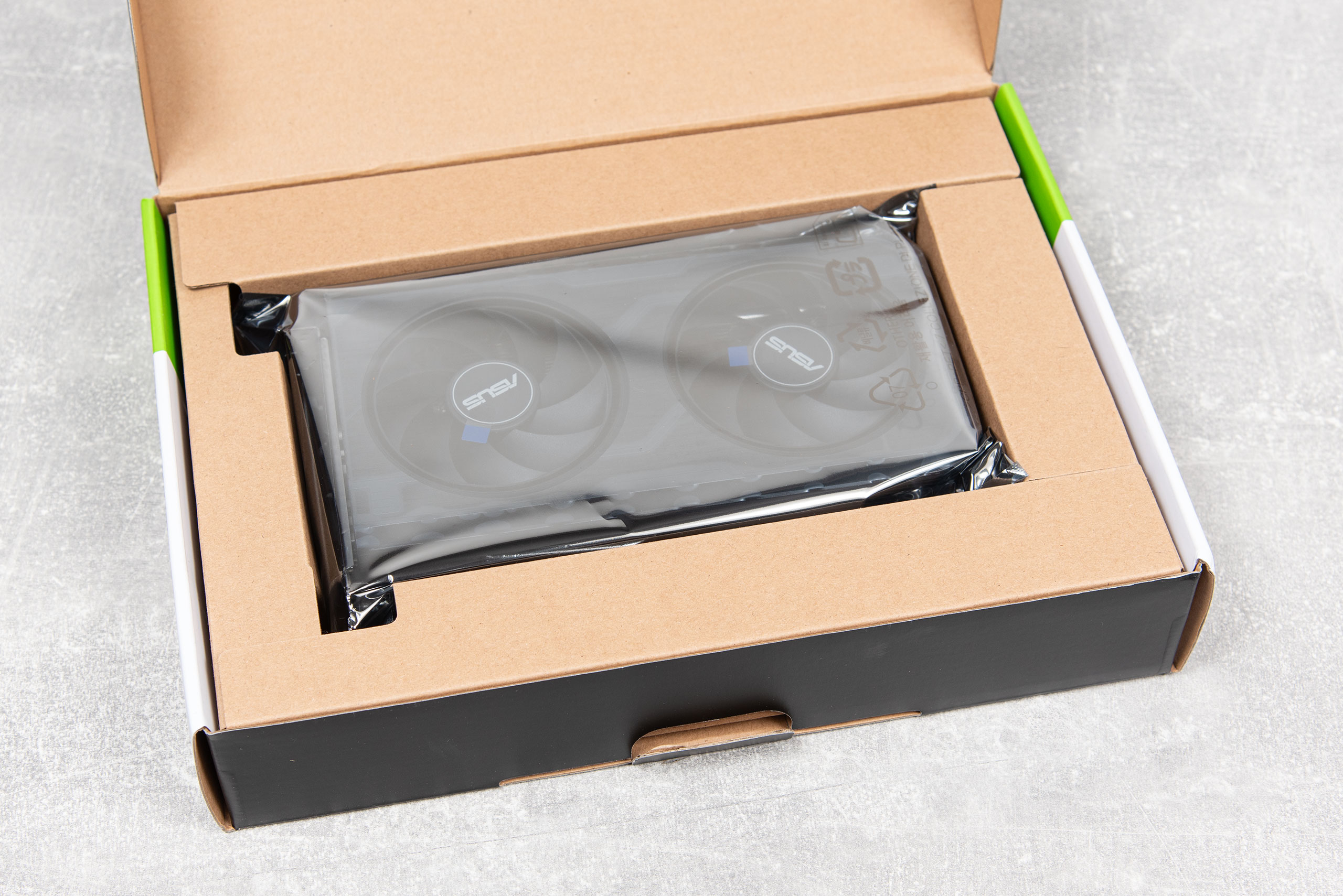 Первой картой на GB207 к нам попала модель обновленной серии Dual компании ASUS. Поставляется она в небольшой коробке с изображенным устройством на лицевой стороне и указанными особенностями и характеристиками на обратной. После открытия крышки сразу ощущается бюджетность продукта — видеокарту защищает сложенная из картона форма вместо вспененного полиэтилена в старших сериях видеоадаптеров.
