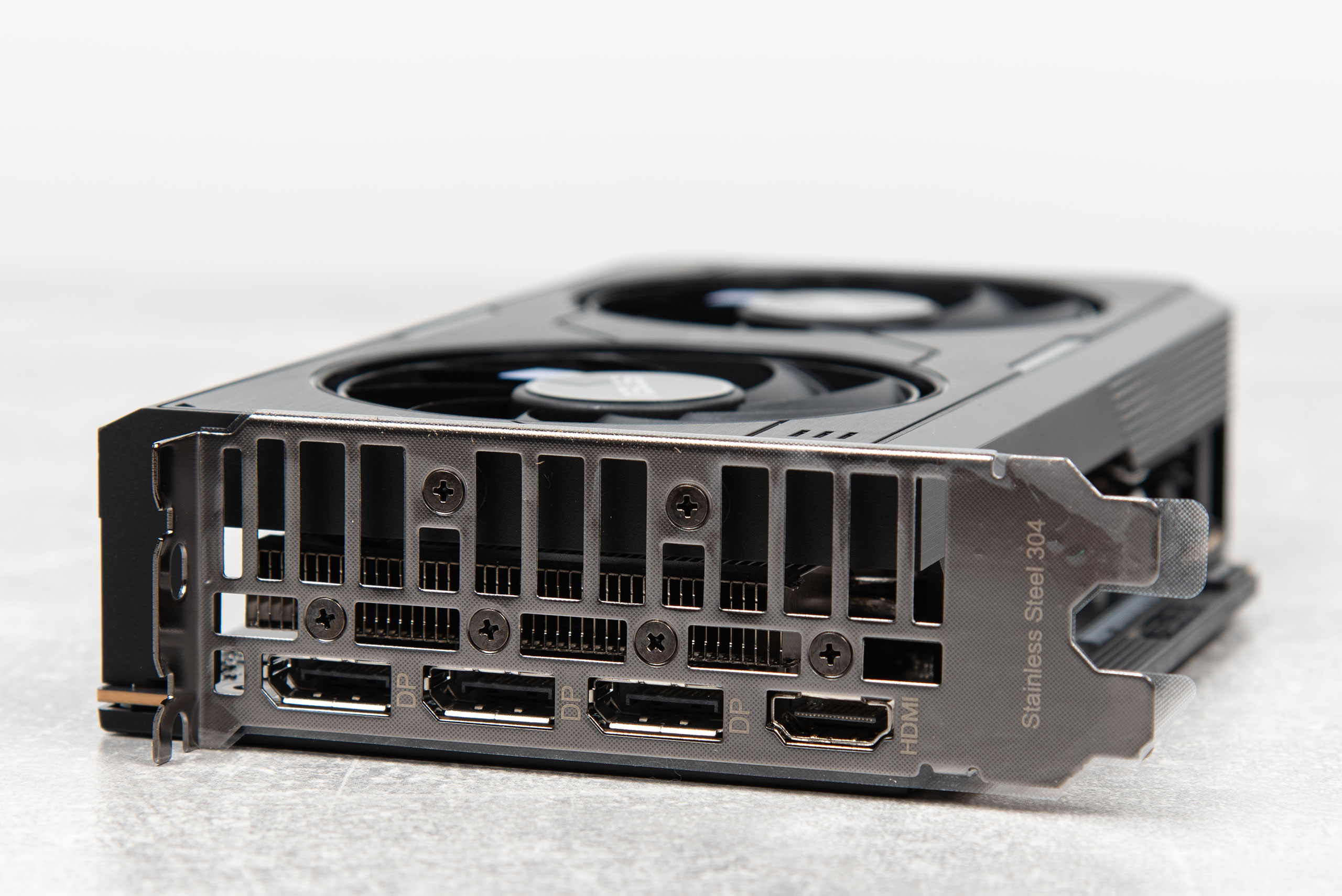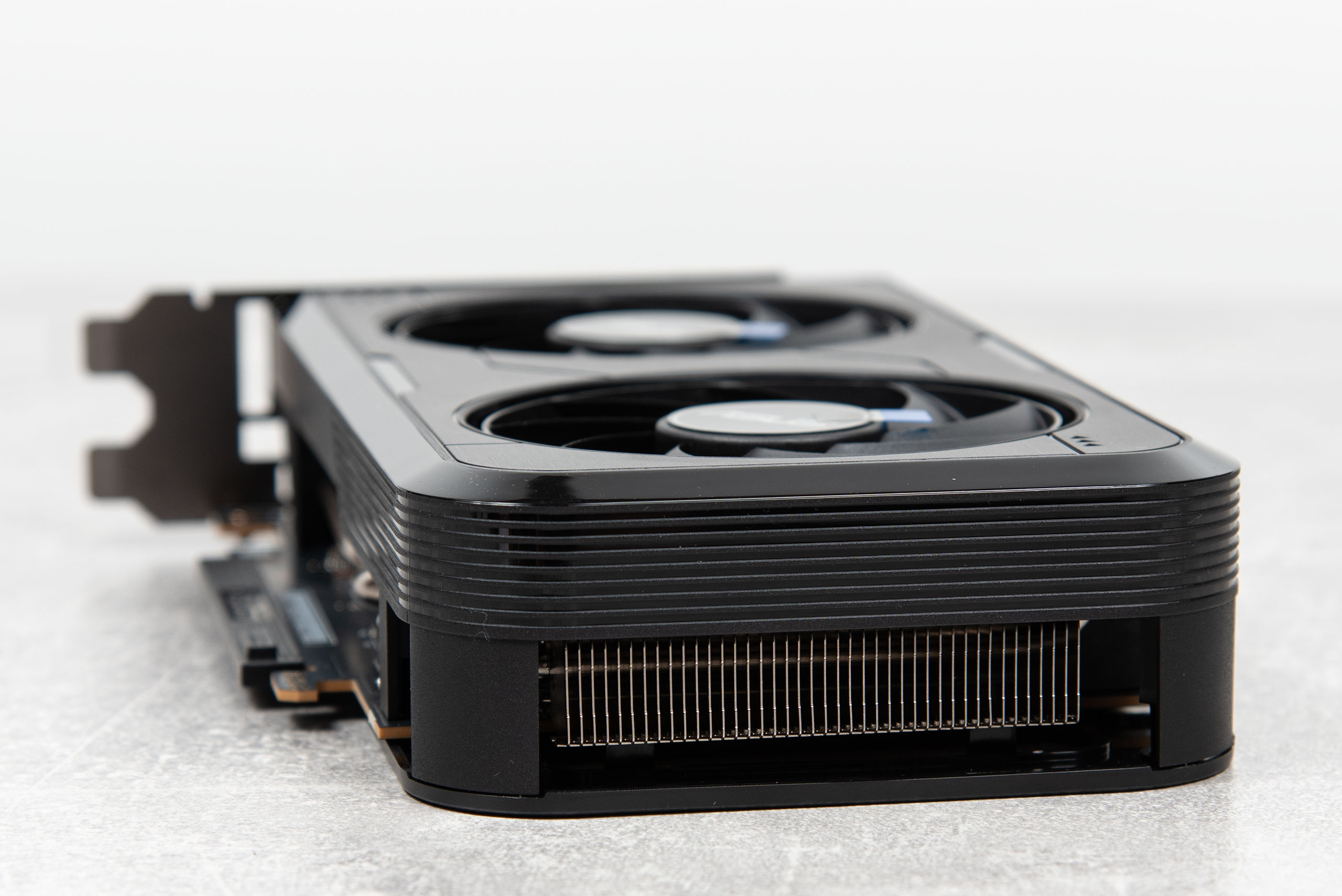 Торец видеокарты закруглен по углам, на задней усилительной пластине имеется маленький вырез для прохождения воздуха, который, видимо, несет лишь декоративную функцию. Размеры модели составляют всего 203×116×40 мм, так что она без проблем поместится в большинстве корпусов и на ее базе можно собрать маленькую игровую систему.