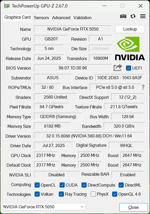 Карта имеет заводской разгон, так что графический чип GB207 работает на частоте 2317 МГц и может ускоряться до 2647 МГц, что больше стандартных 2572 МГц. Если установить фирменное приложение GPU Tweak III, то максимальный показатель можно будет увеличить до 2677 МГц. Память GDDR6 взаимодействует с чипом через 128-битную шину, имеет общий объем в 8 Гбайт и функционирует со скоростью 20 ГТ/с.