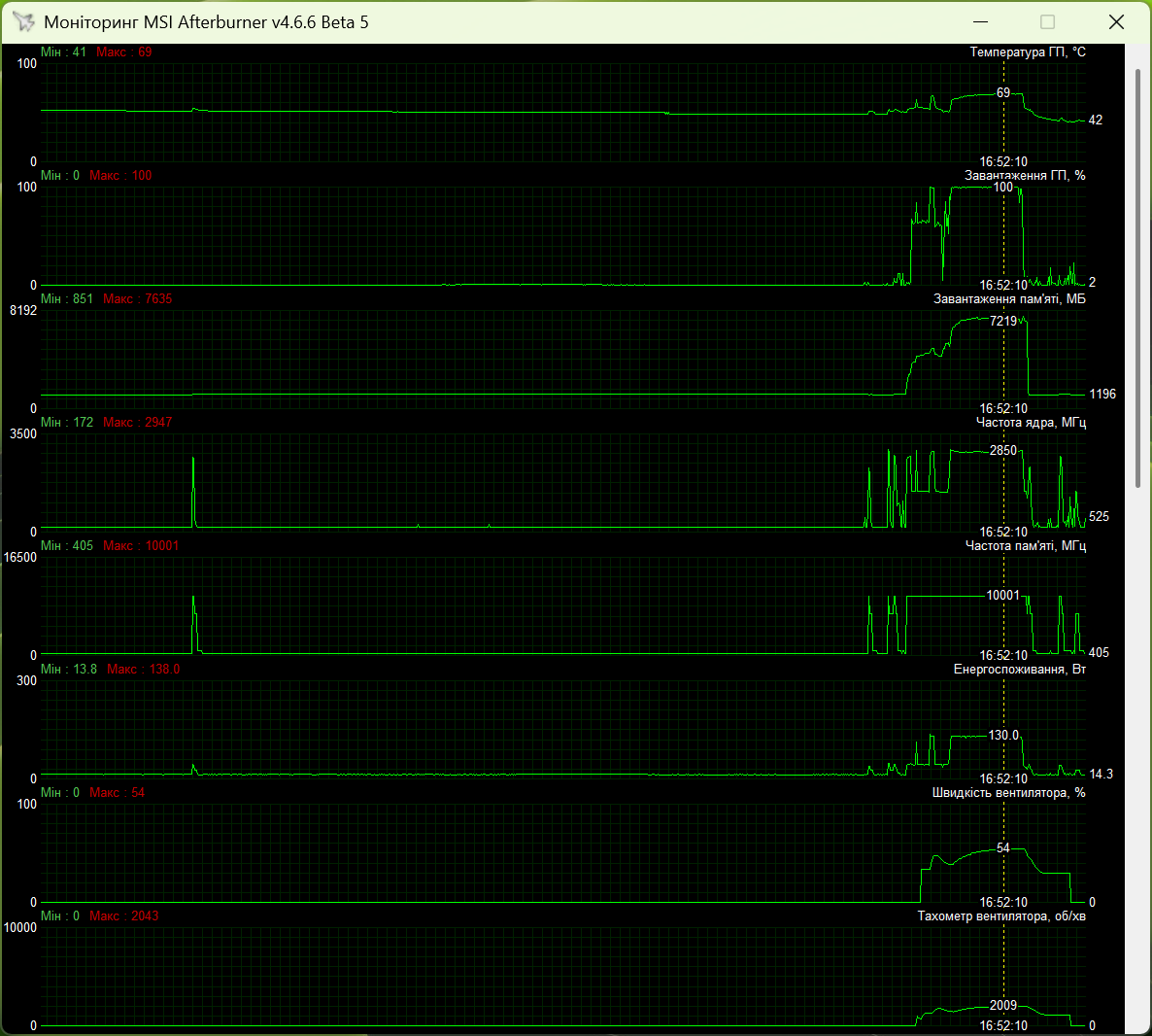 Разогнать карту удалось на 225 МГц по чипу при 115-процентном лимите мощности. Быстродействие памяти было ограничено 21,5 ГТ/с, а при его увеличении в некоторых играх система просто перезагружалась.