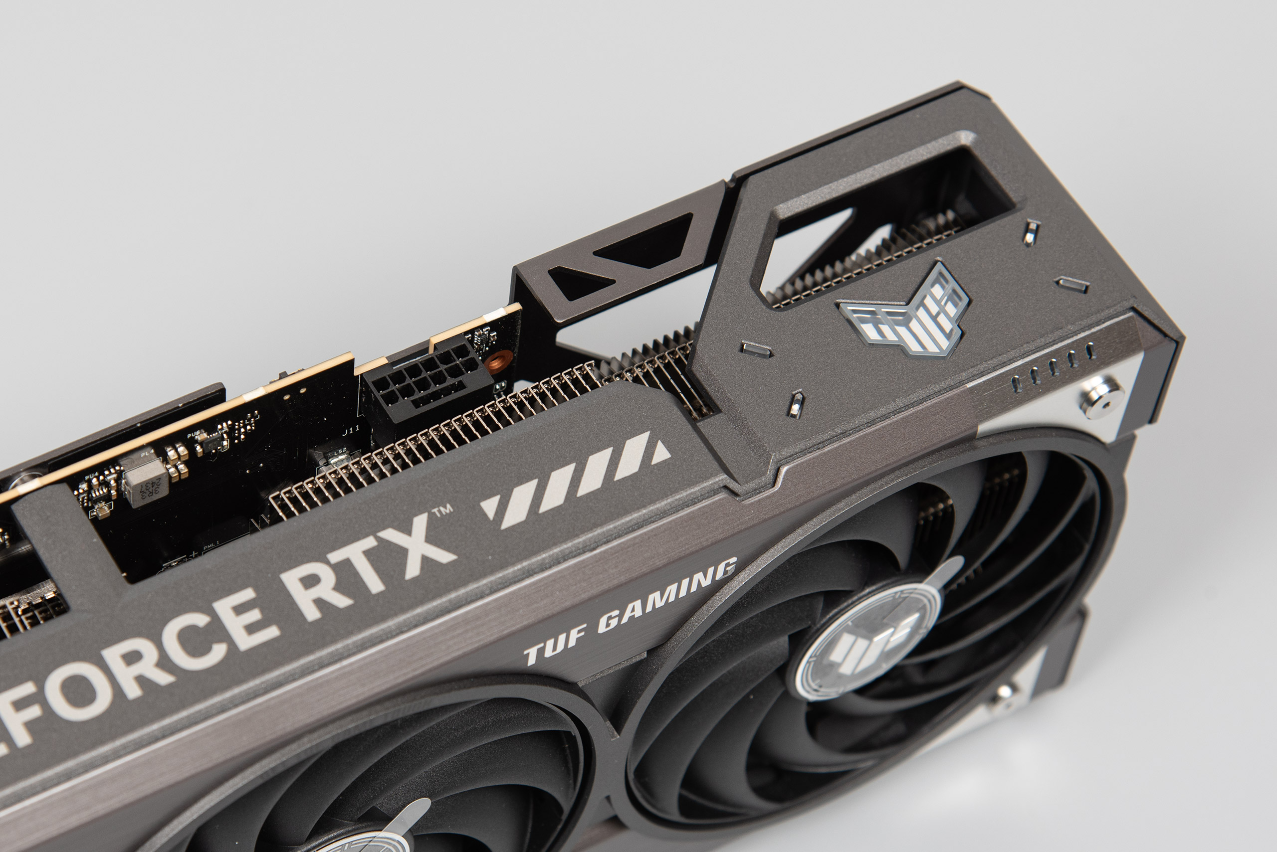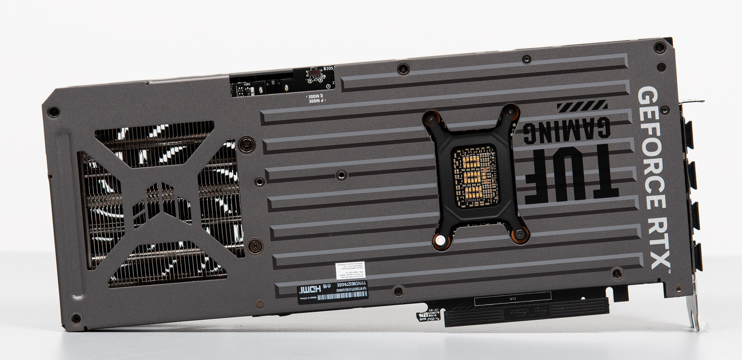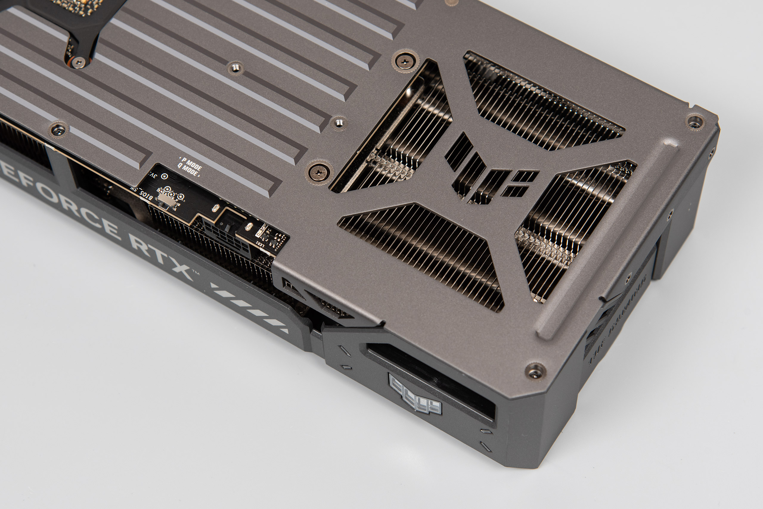 Питание карты осуществляется через разъем 12V2x6, который размещен чуть дальше середины адаптера. На краю сверху кожуха системы охлаждения размещен декоративный элемент в виде логотипа TUF с RGB-подсветкой с поддержкой Aura Sync. Есть возможность выбрать режим работы видеоадаптера — тихий или производительный — соответствующий переключатель находится на обратной стороне, возле разъема питания.