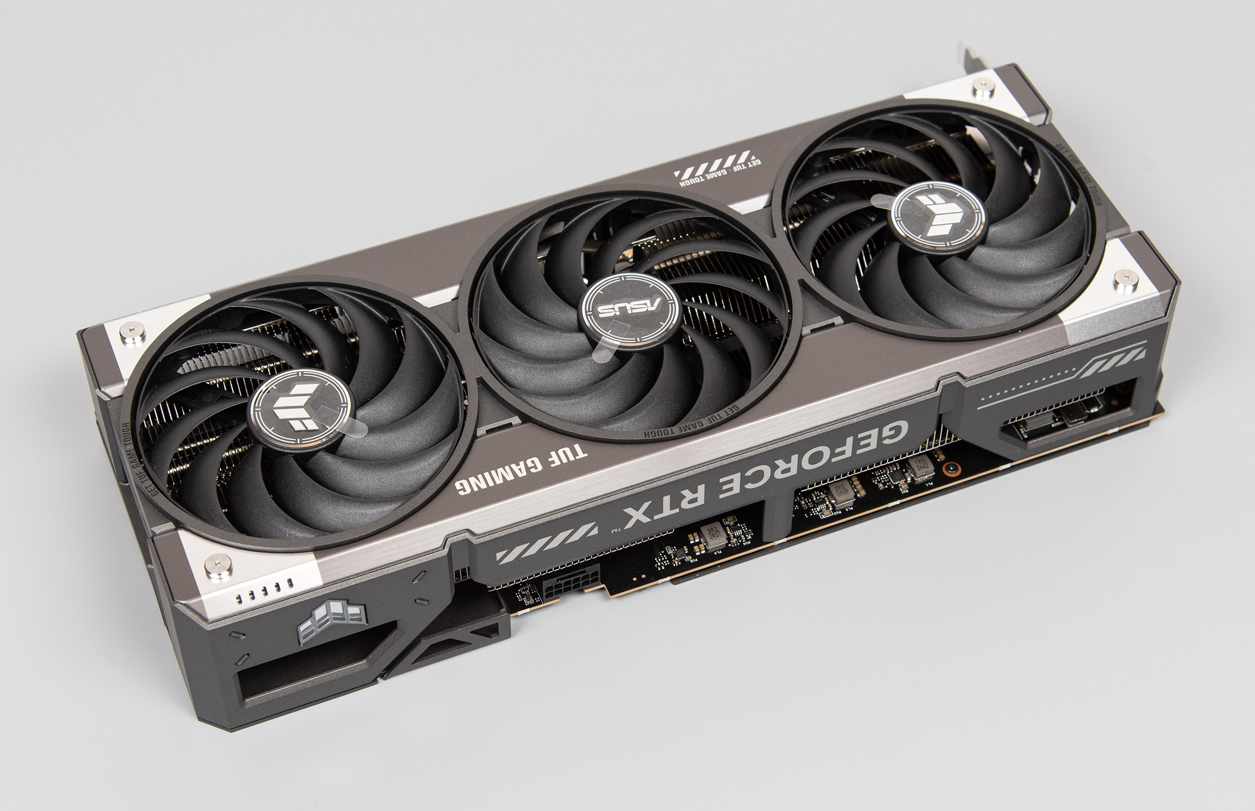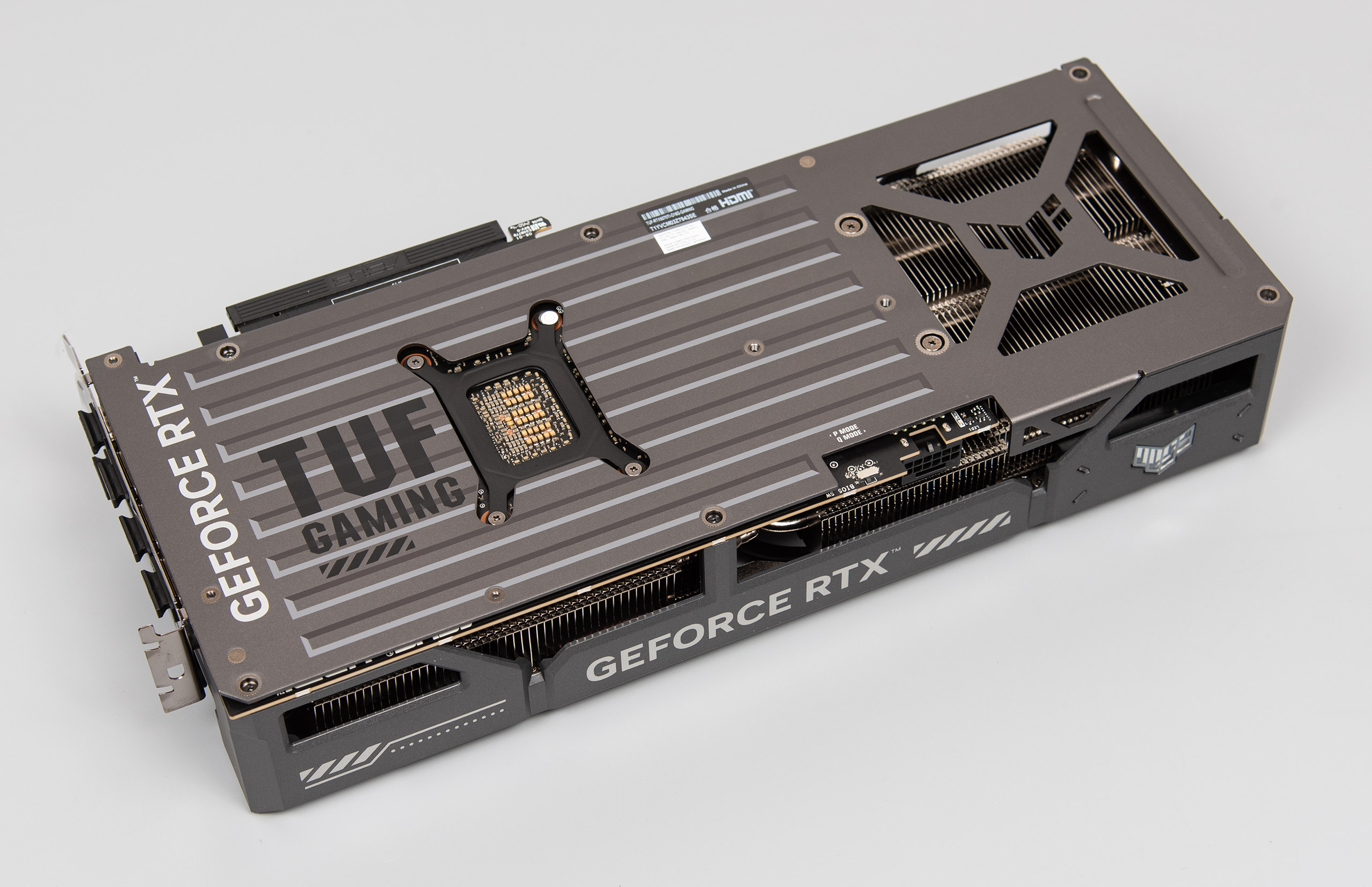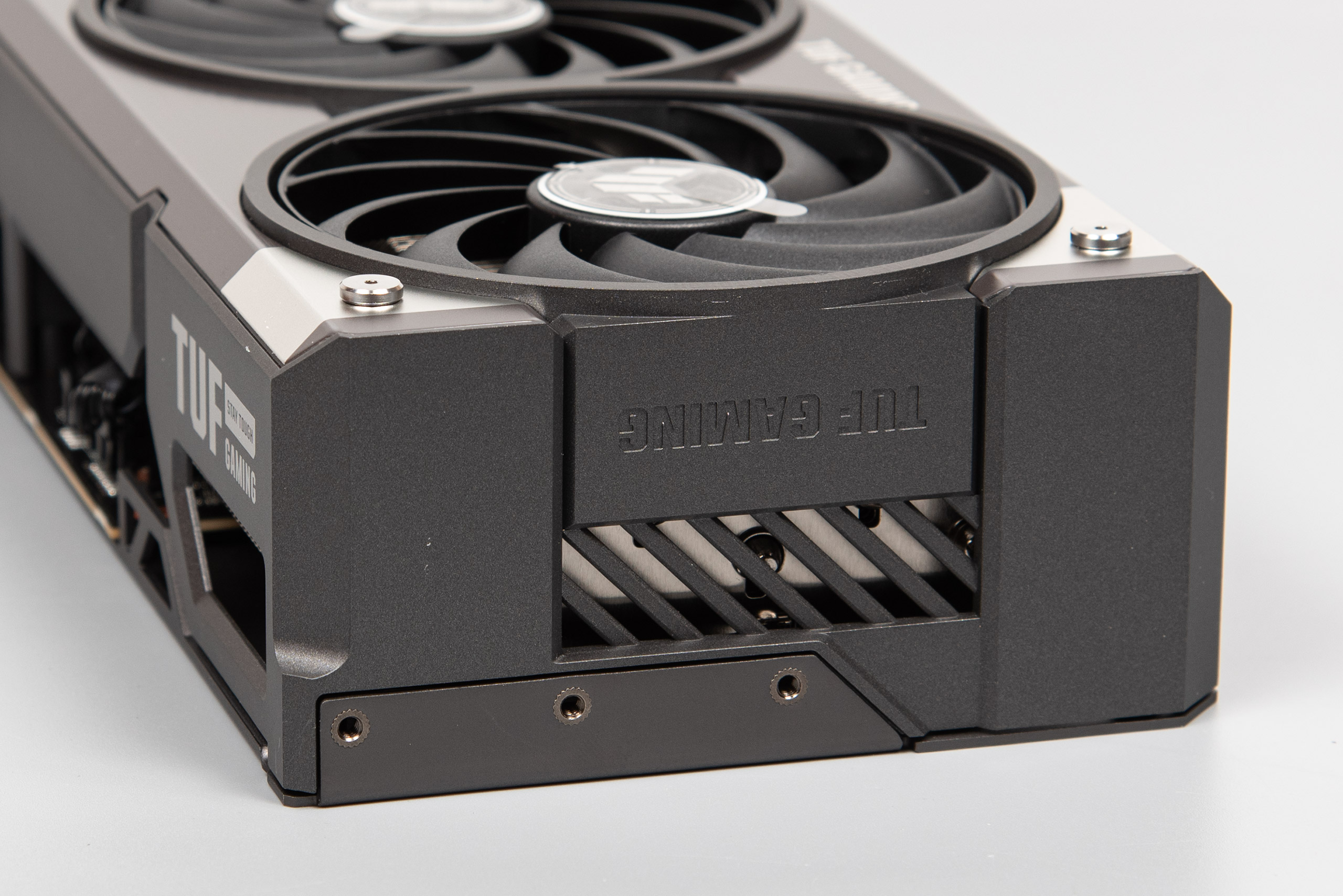 Питание карты осуществляется через разъем 12V2x6, который размещен чуть дальше середины адаптера. На краю сверху кожуха системы охлаждения размещен декоративный элемент в виде логотипа TUF с RGB-подсветкой с поддержкой Aura Sync. Есть возможность выбрать режим работы видеоадаптера — тихий или производительный — соответствующий переключатель находится на обратной стороне, возле разъема питания.