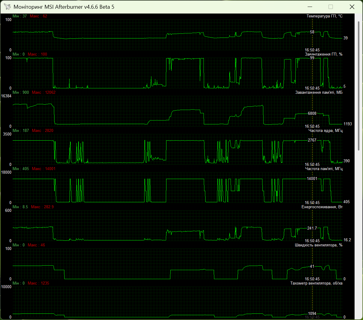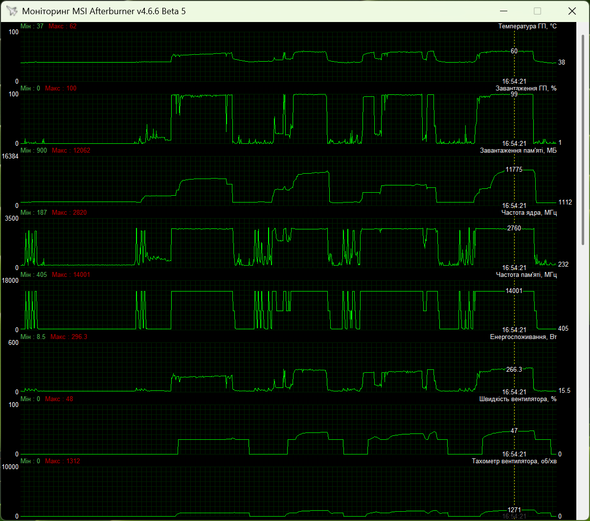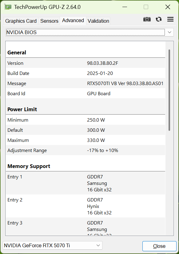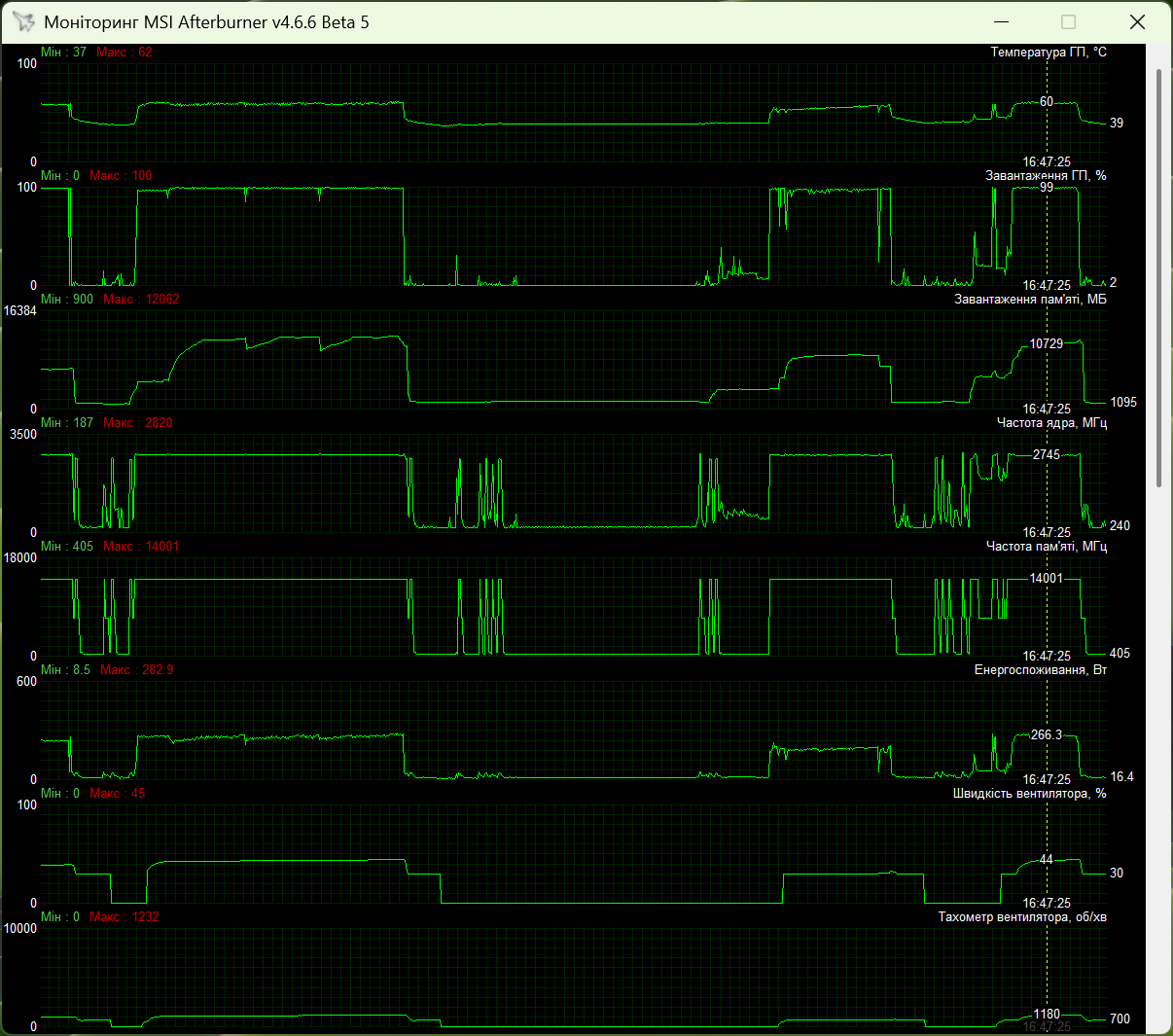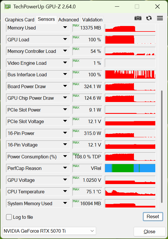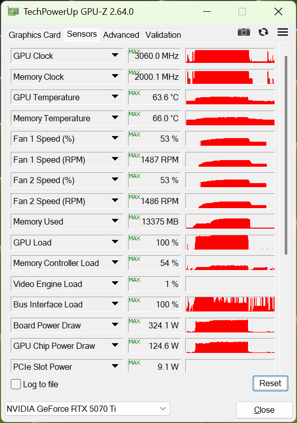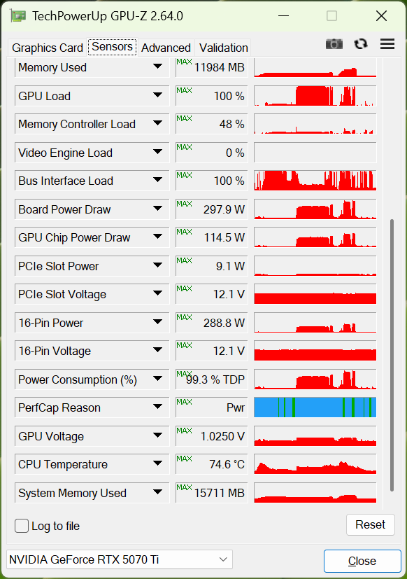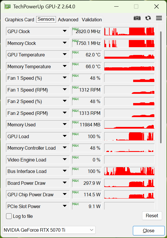 Ядро нагревалось до 62 градусов, память — 66 °C, но, как видим, показатели HotSpot теперь не доступны. Потребление карты составляет почти 300 Вт, но при использовании более нового на момент тестирования драйвера этот показатель был ниже, из-за чего ускорение GPU было ограниченным, а результаты в играх уже не столь хороши, как на релизе серии GeForce RTX 5070 Ti. Скорость вентиляторов составляла 1300 об/мин, температура в помещении — 20 °C.
