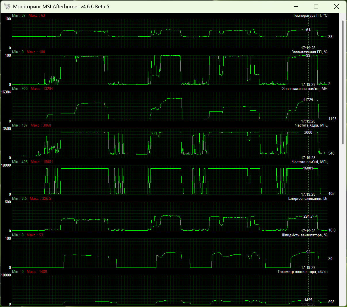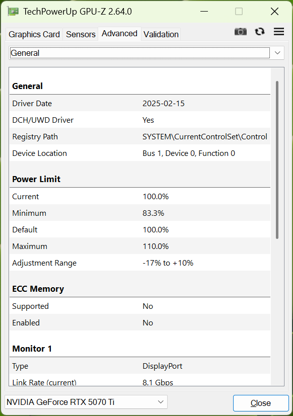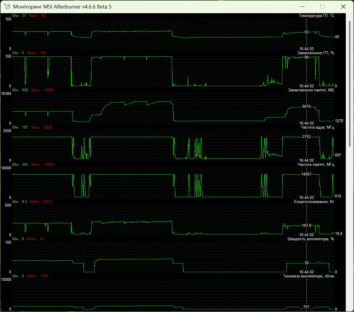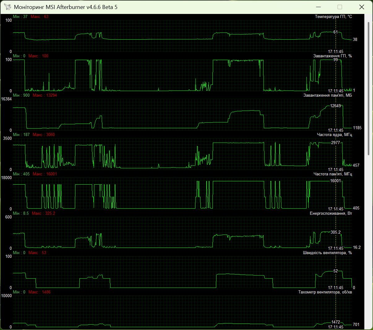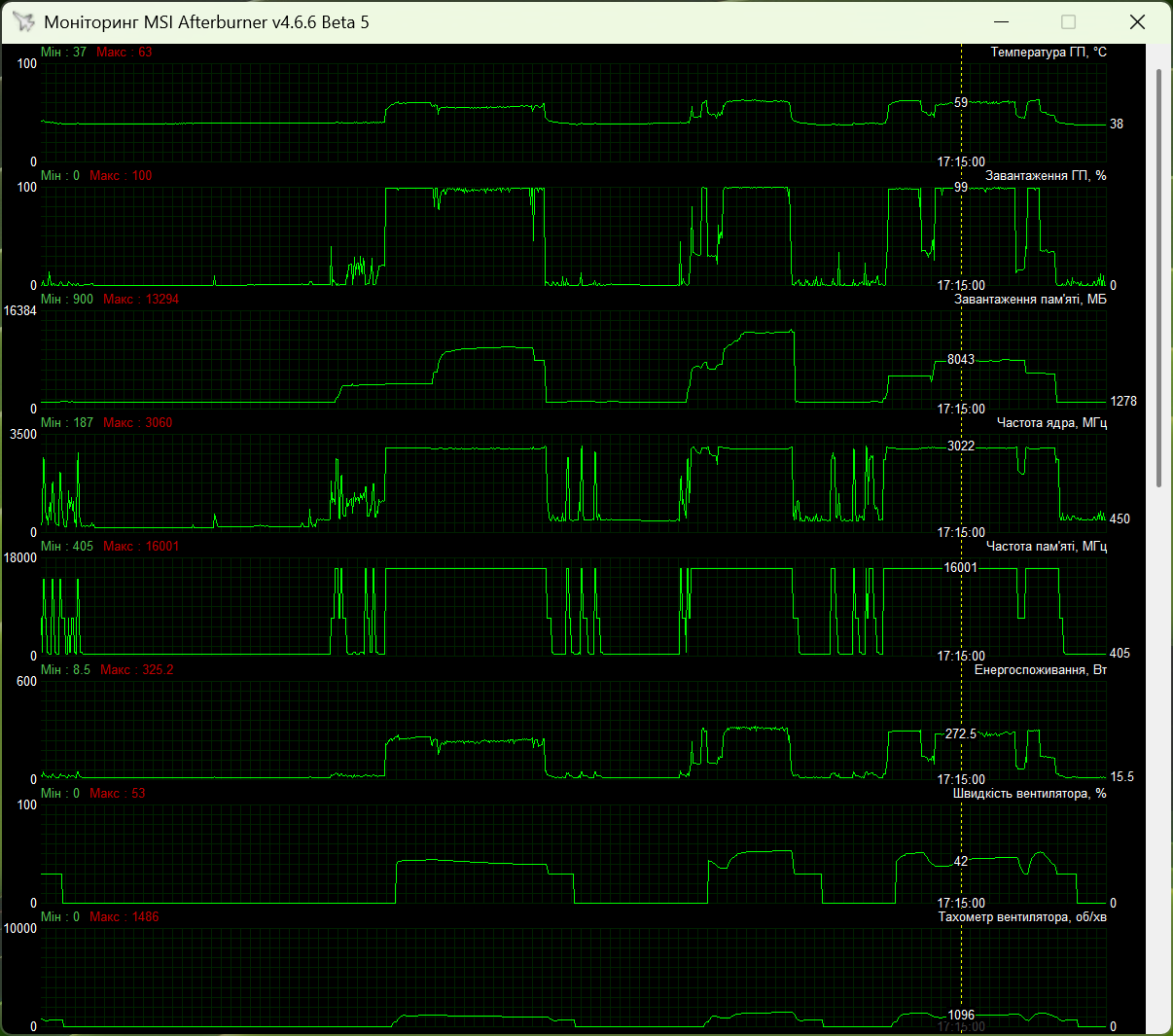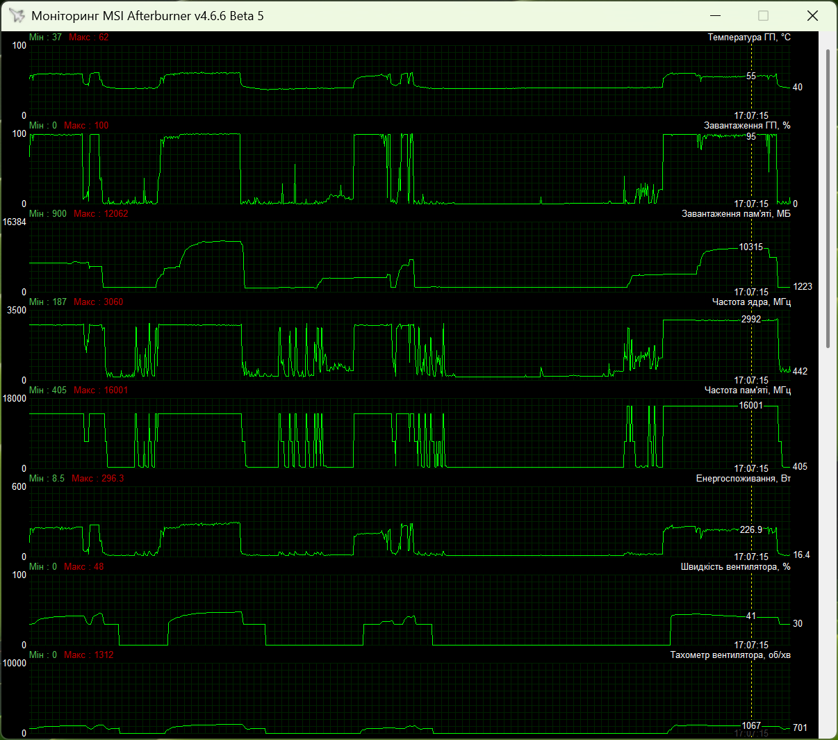 Ядро нагревалось до 62 градусов, память — 66 °C, но, как видим, показатели HotSpot теперь не доступны. Потребление карты составляет почти 300 Вт, но при использовании более нового на момент тестирования драйвера этот показатель был ниже, из-за чего ускорение GPU было ограниченным, а результаты в играх уже не столь хороши, как на релизе серии GeForce RTX 5070 Ti. Скорость вентиляторов составляла 1300 об/мин, температура в помещении — 20 °C.