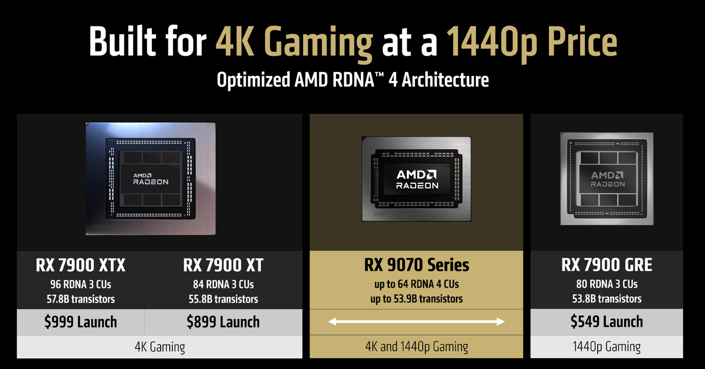Несмотря на уменьшение количества потоковых процессоров в чипах Navi 48 количество транзисторов почти не изменилось относительно старших представителей прошлого поколения и составляет 53,9 млрд при площади кристалла в 357 мм². Последний параметр фактически равен характеристикам Radeon RX 7800 XT. По производительности новинки должны занять нишу между Radeon RX 7900 GRE и Radeon RX 7900 XT/XTX, при этом новое именование намекает на конкуренцию с картами «зеленого» лагеря серии GeForce RTX xx70.