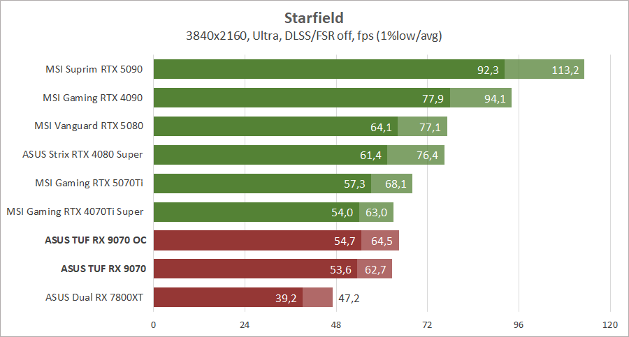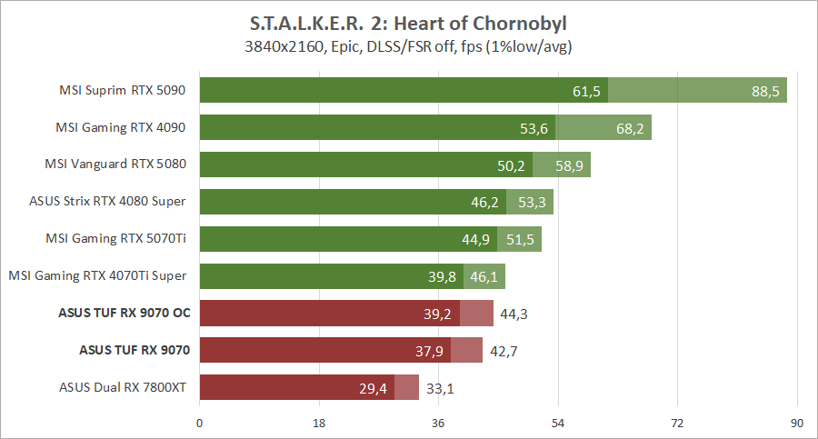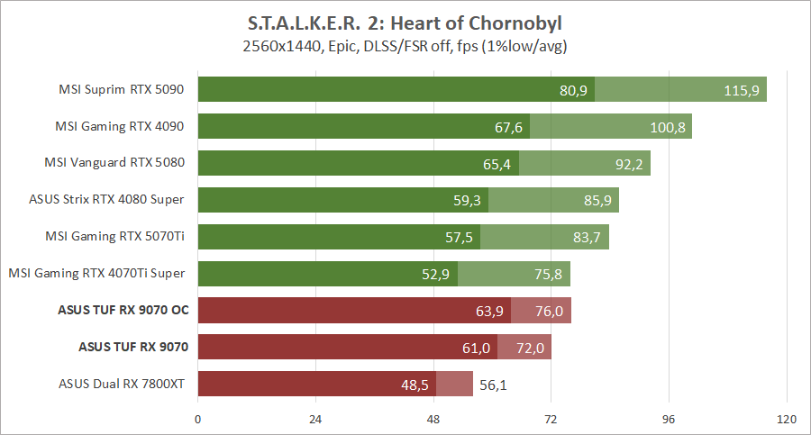 Для сравнения возьмем видеокарты MSI GeForce RTX 5090 Suprim SOC, GeForce RTX 5080 Vanguard SOC Launch Edition, GeForce RTX 5070 Ti 16G Gaming Trio OC Plus, GeForce RTX 4090 Gaming X Trio, ASUS ROG-STRIX-RTX4080S-O16G-WHITE и MSI GeForce RTX 4070 Ti Super 16G Gaming Slim STALKER 2 Edition.