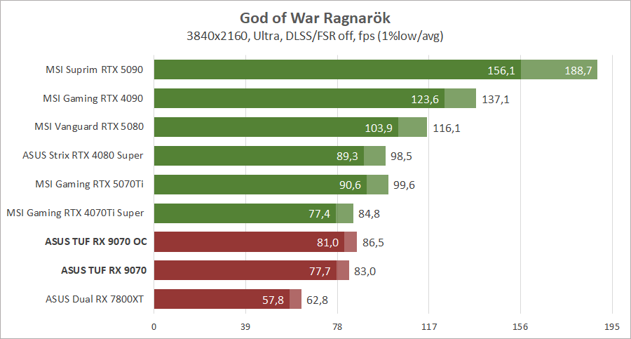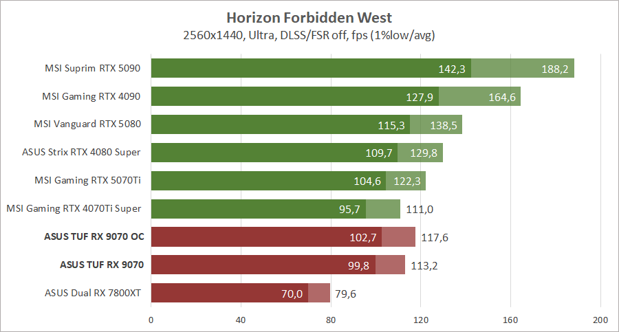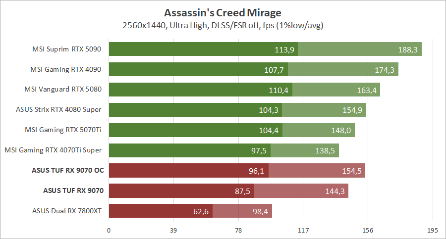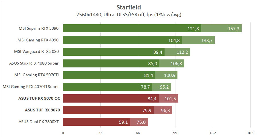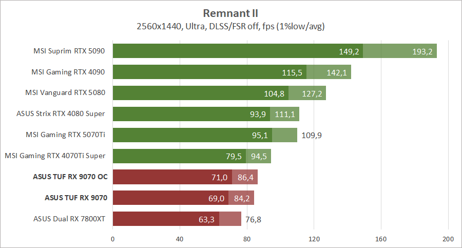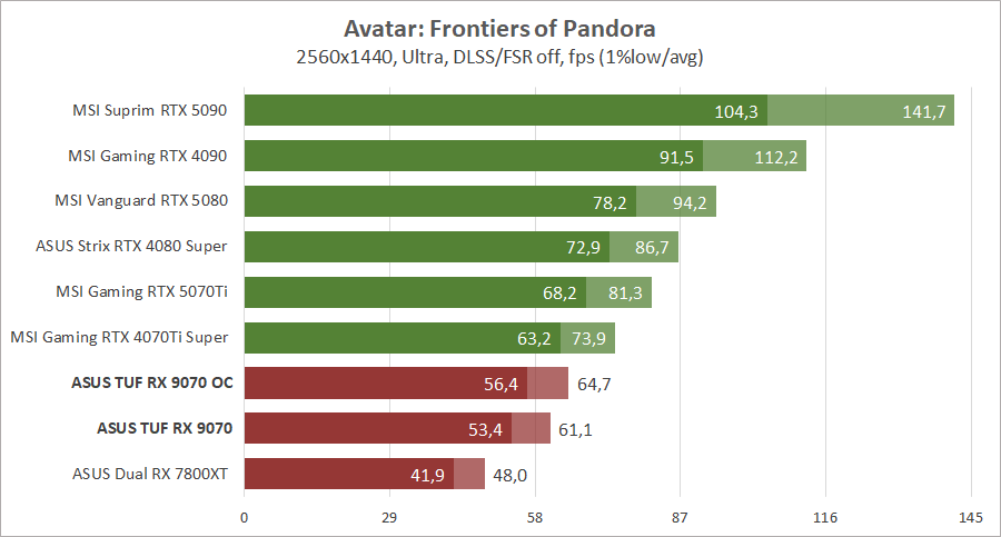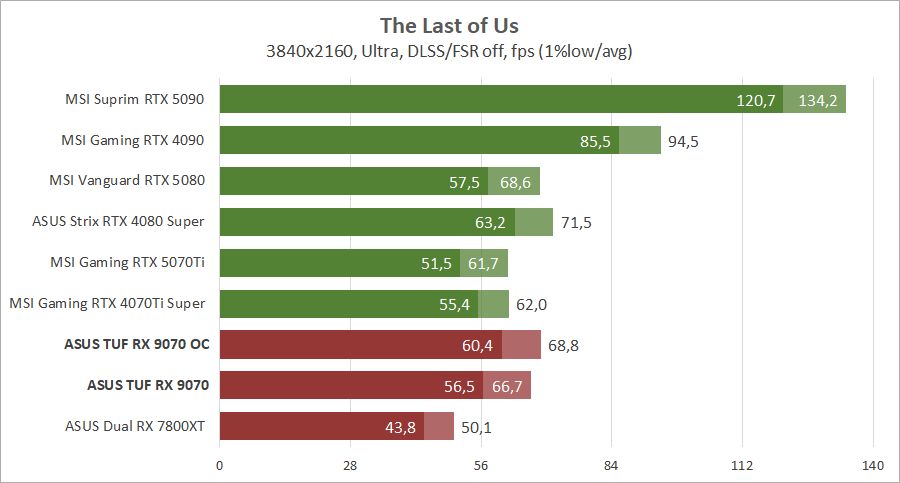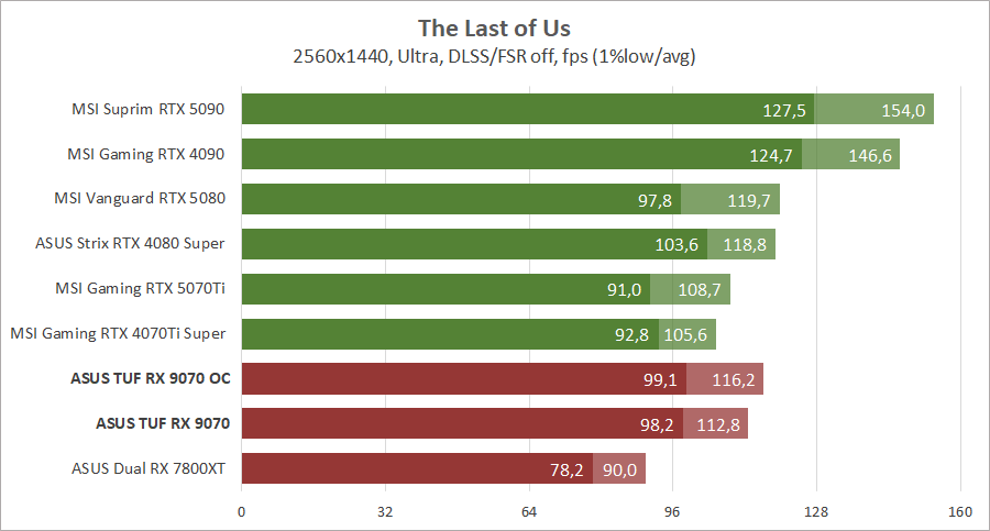 Компания AMD провела неплохую оптимизацию архитектуры и теперь новейшая видеокарта Radeon RX 9070 обходит Radeon RX 7800 XT с большим количеством вычислительных блоков. И эта разница иногда достигает полутора раз, что весьма неплохо при небольшой разнице в цене. Блок ускорения рейтрейсинга был также переработан и разница между картами становится еще большей при активировании трассировки лучей, но до «зеленых» конкурентов новинке еще далеко. С другой стороны, по чистой производительности Radeon RX 9070 без проблем конкурирует с GeForce RTX 4070 Ti Super и иногда с новейшей GeForce RTX 5070 Ti, и это при меньшем потреблении энергии, даже на фоне предшественника архитектуры RDNA 3. У нас не хватает для сравнения старших адаптеров прошлой серии Radeon, но мы это исправим в следующих обзорах, возможно, тогда даже успеет к нам Radeon RX 9070 XT.