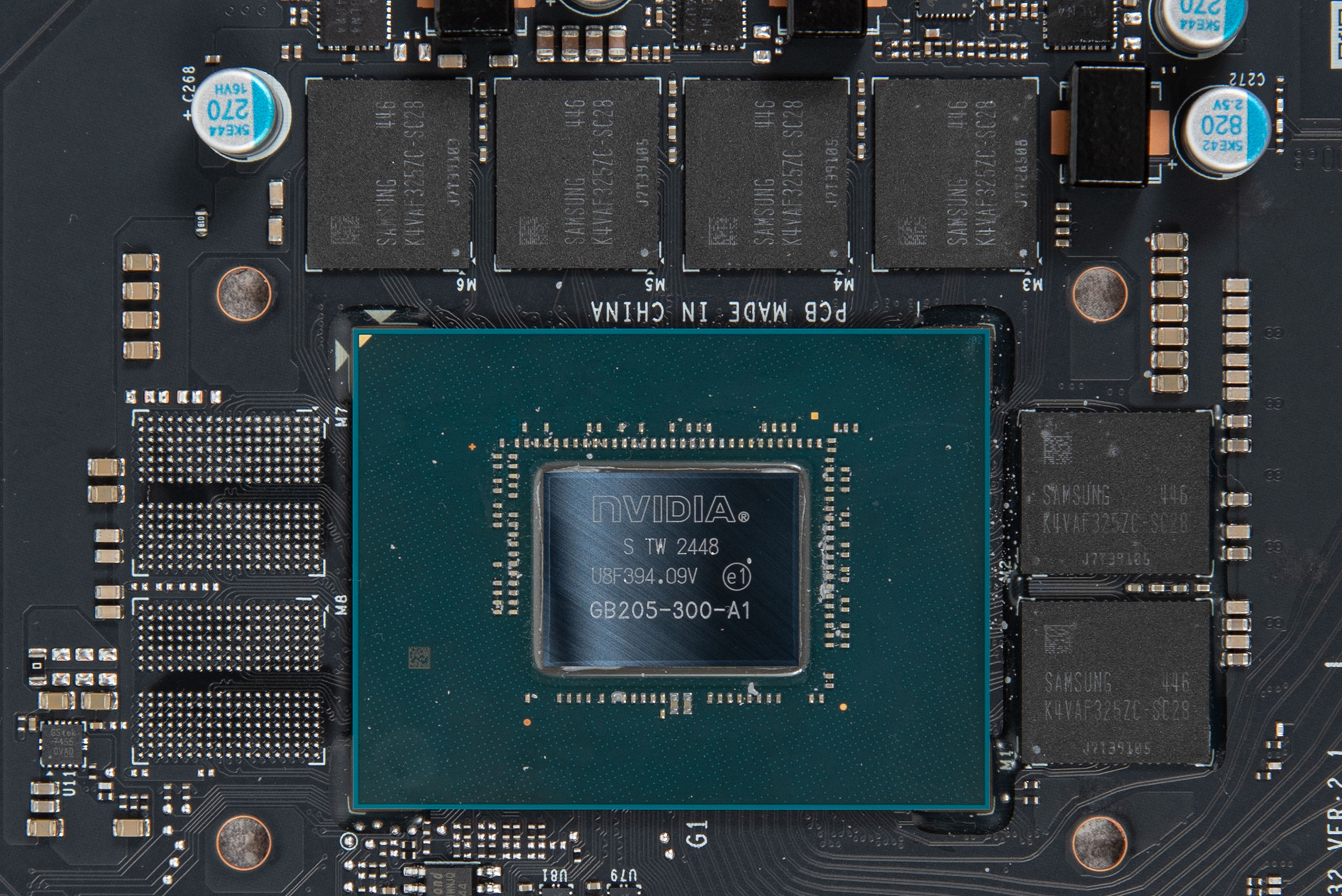 Установлен графический процессор GB205-300-A1. Он продолговатый и без защитной рамки. Память общим объемом 12 Гбайт набрана из шести микросхем Samsung K4VAF325ZC-SC28.