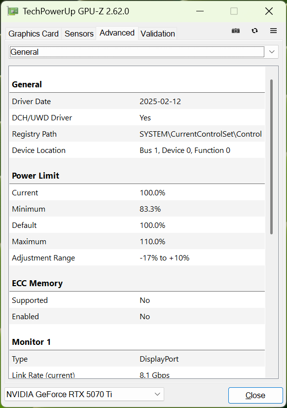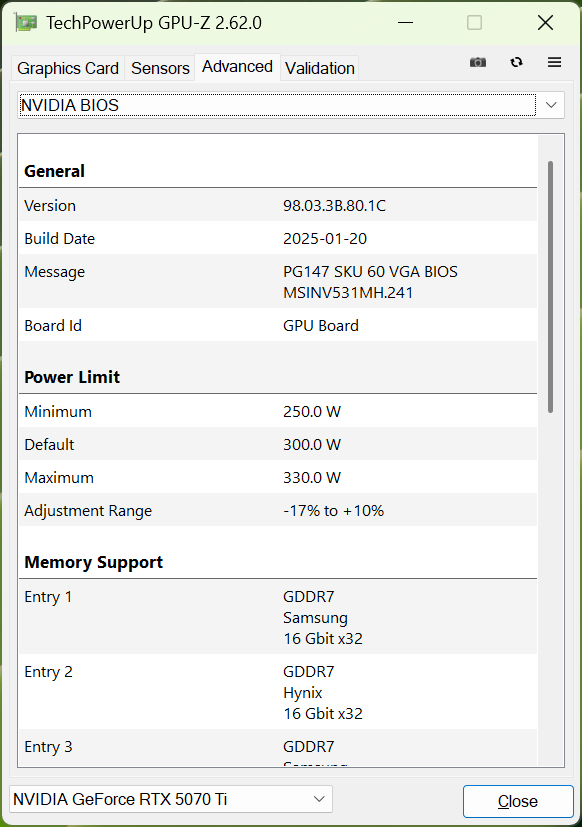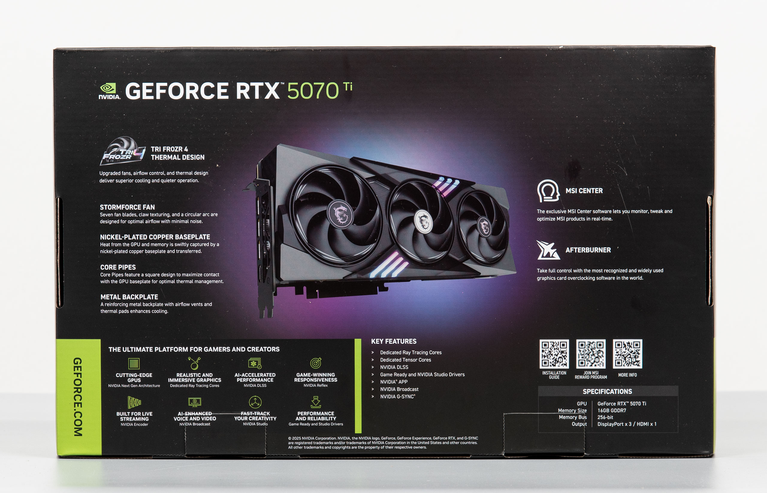 В GeForce RTX 5070 Ti используется графический процессор GB203 от старшей модели, только количество потоковых процессоров уменьшено до 8960 штук (соответственно, остальные блоки также в меньшем количестве). Работает он на частоте 2295 МГц с автоматическим ускорением до 2572 МГц, а если установить фирменное приложение MSI Center, то этот показатель можно будет увеличить до 2580 МГц. Память стандарта GDDR7 и общим объемом 16 Гбайт взаимодействует с GPU через 256-битную шину на скорости 28 ГТ/с.