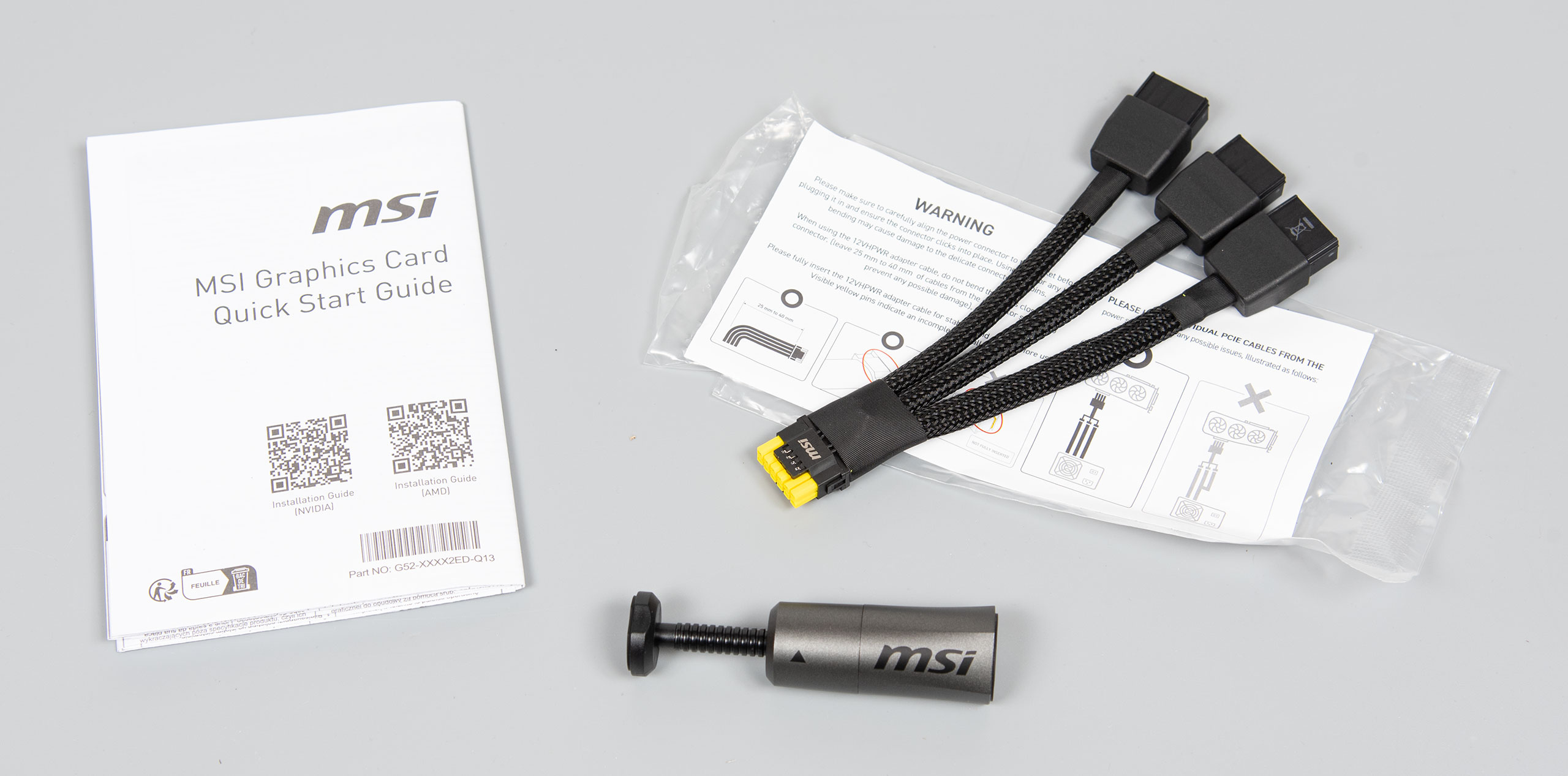 В комплекте поставки имеем документацию, стойку нового дизайна и переходник питания с трех обычных 8-контактных разъемов на 12VHPWR, который имеет желтую зону на новейшем коннекторе для визуального подтверждения правильного подключения к карте.