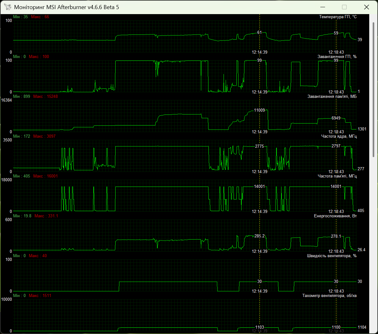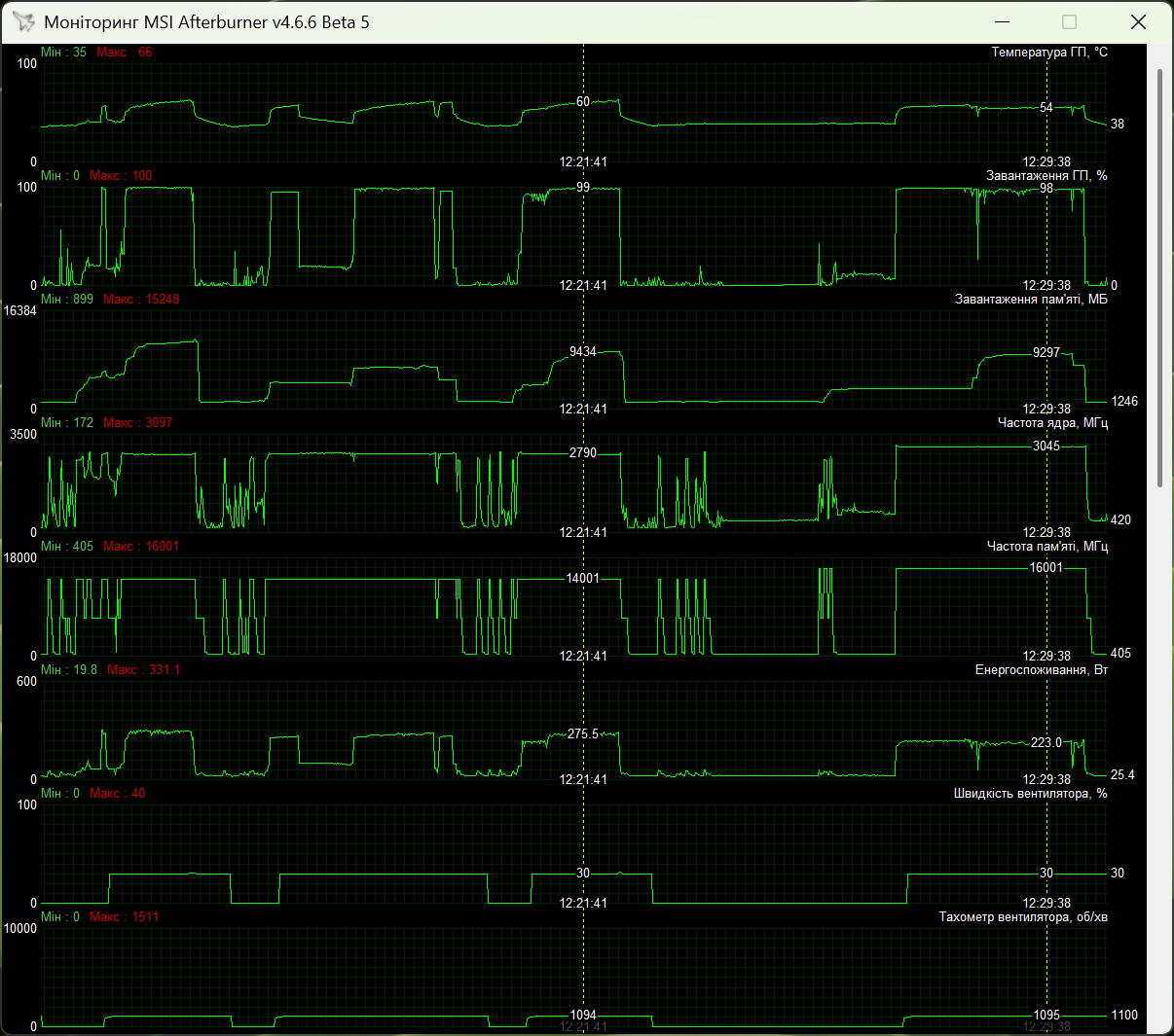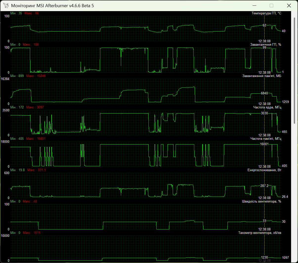 Температуры выросли на два градуса, при этом скорость вентиляторов доходила до 1380 об/мин, а потребление карты достигало 330 Вт.