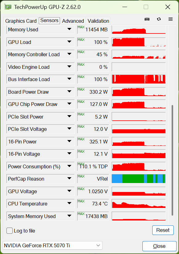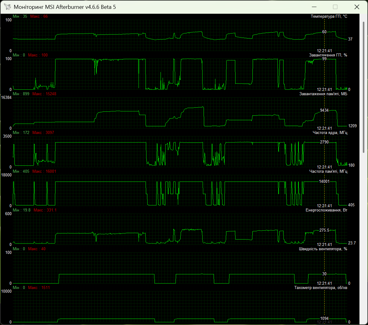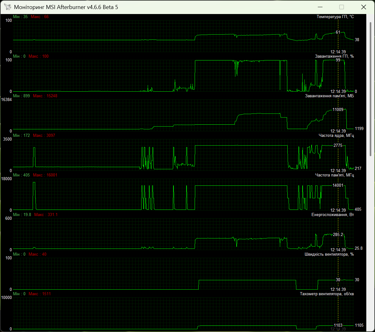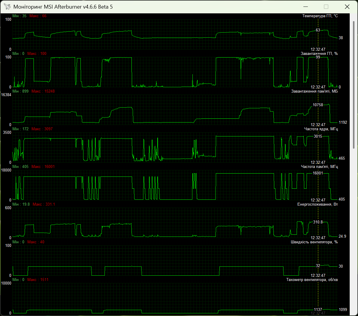 Температуры выросли на два градуса, при этом скорость вентиляторов доходила до 1380 об/мин, а потребление карты достигало 330 Вт.