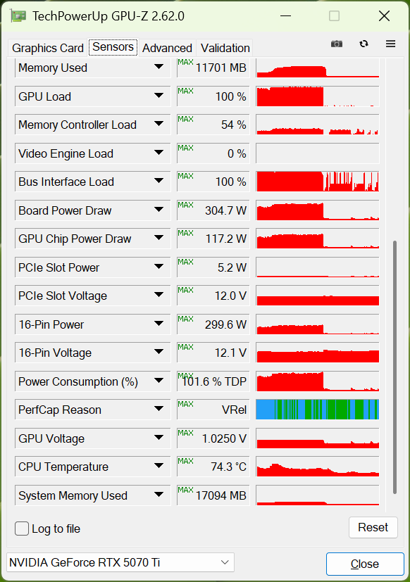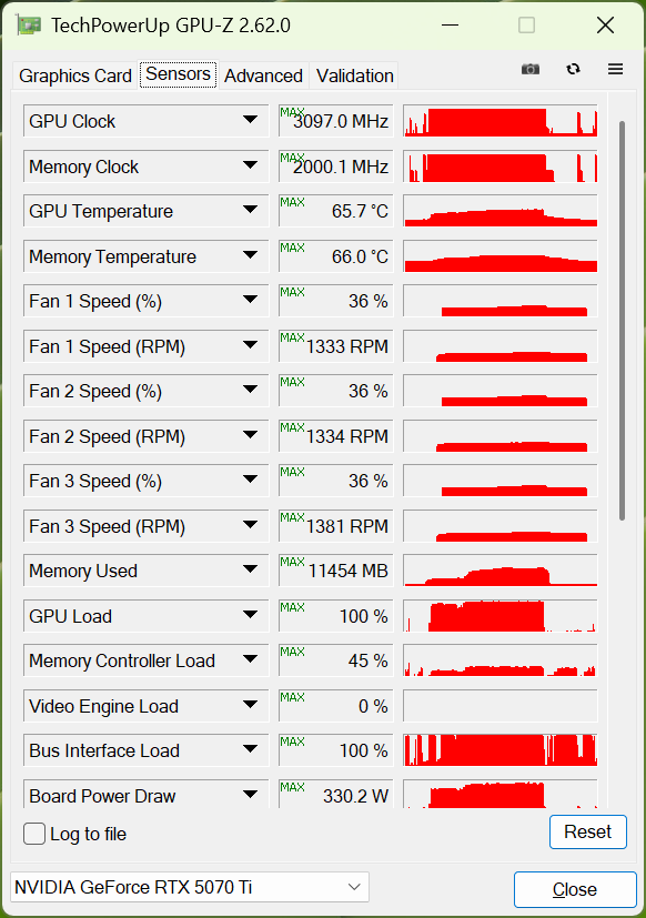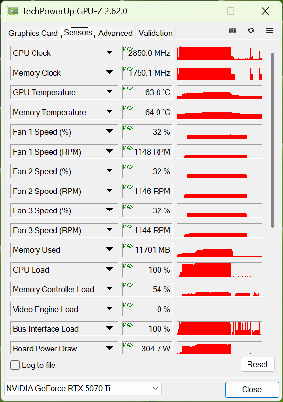 Температура графического процессора равнялась 63,8 °C, памяти — 64 градуса, а показатели HotSpot уже отсутствуют в данном поколении видеокарт. Скорость вентиляторов достигала всего-то 1145 об/мин, что делает карту достаточно тихой в использовании. Потребление устройства составило 304 ватта.