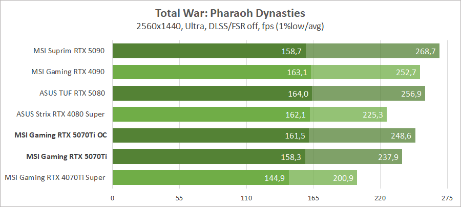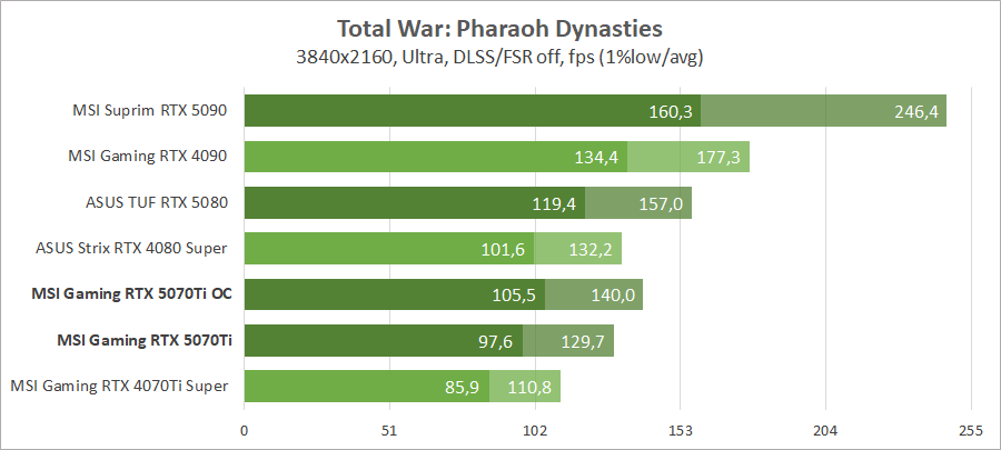 Тестирование в игровых бенчмарках происходило при разрешениях 2560x1440 и 3840x2160 с пресетами качества графики Ultra (Ultra High, Very High). Также были добавлены режимы с активированной, где это возможно, трассировкой лучей с технологией масштабирования в режиме «Качество». В играх, где не использовался стандартный бенчмарк, показатели фиксировались в следующих случаях: