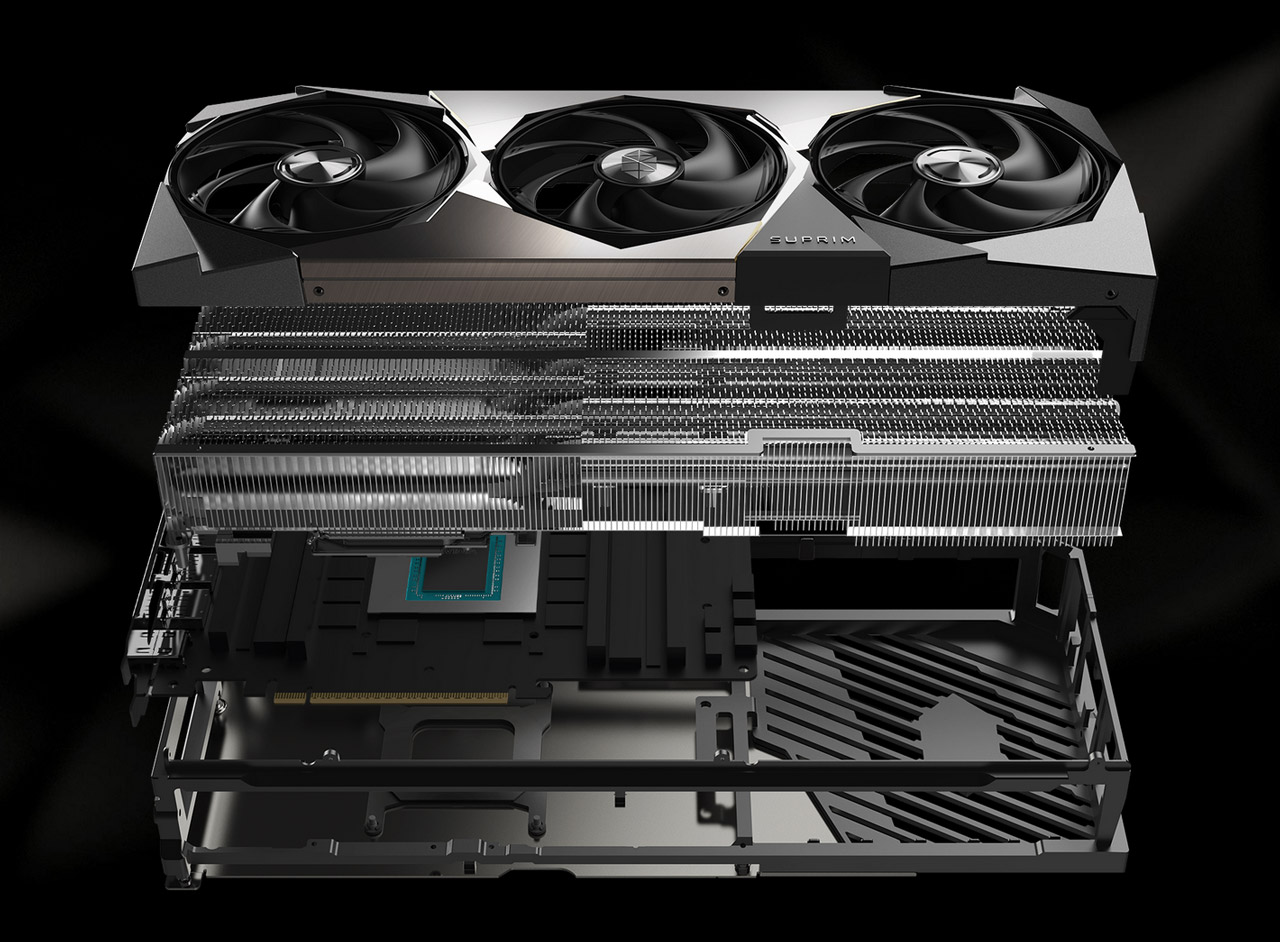 Видеокарта принадлежит топовой серии Suprim, поэтому выглядит соответственно. Дизайн имеет черты устройств как прошлого поколения, так и еще более старого и напоминает обработанные грани бриллианта, что подчеркивает статус продукта.