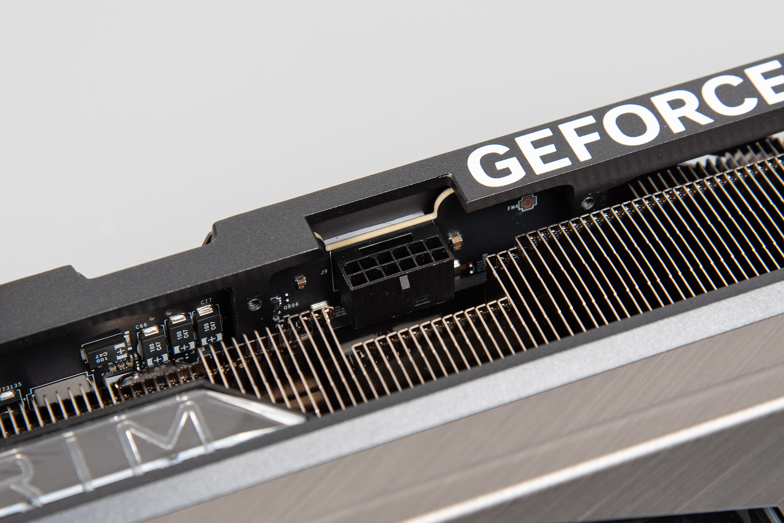 Питание на карту подается через усовершенствованный разъем 12VHPWR, который находится по центру. При тестировании каких-то проблем с ним не было, хотя кабель от блока питания за два года повидал уже далеко не одну видеокарту.