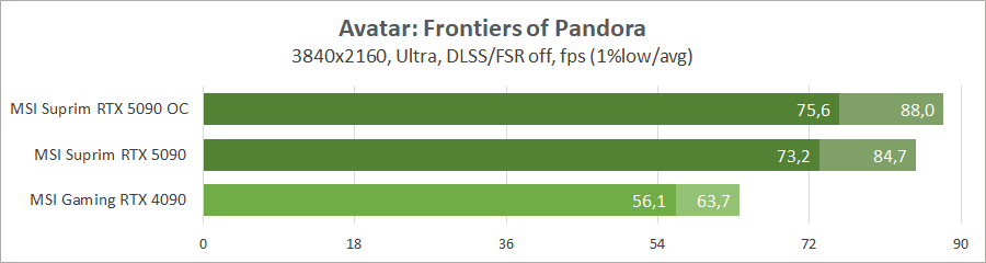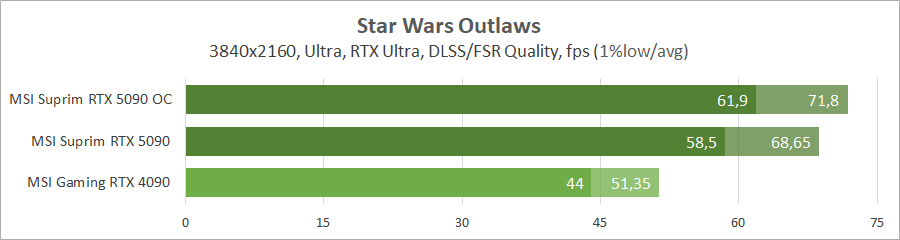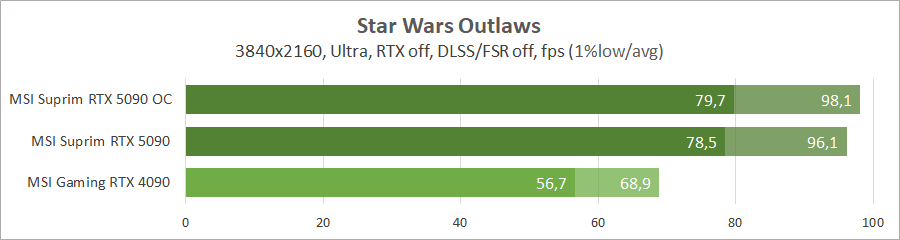 В реальных играх частота графического процессора достигала больших значений, а именно 2737–2805 МГц в Avatar: Frontiers of Pandora, 2715–2812 МГц в Star Wars Outlaws, 2820–2865 МГц в Cyberpunk 2077 и 2857–2880 МГц в Assassin's Creed Mirage.