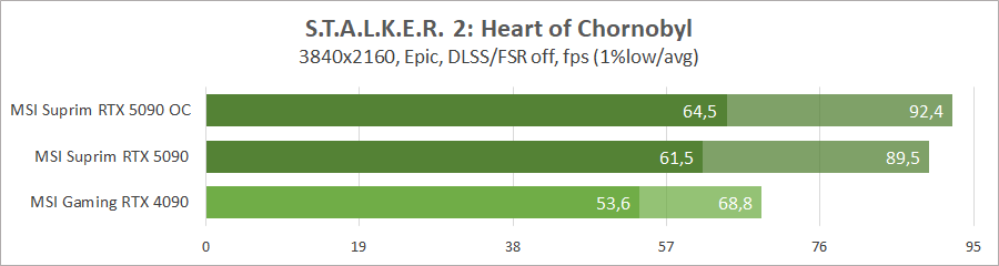 Что ж, у нас новый чемпион, способный демонстрировать недостижимую ранее производительность. GeForce RTX 5090 обходит своего предшественника на 20–50 процентов в 4K при максимальной настройке графики, что позволяет попробовать играть при еще большем разрешении. Для такого мощного ядра были соответственно увеличены разрядность шины и объем памяти, что можно назвать лишним для развлечений и так необходимым для работы. Но все сделано не даром и за все нужно платить. Чип оказался достаточно большим, сложным и с фантастическим потреблением энергии, что требует эффективной системы охлаждения. И по видеокарте MSI GeForce RTX 5090 Suprim SOC мы это видим — она габаритная и тяжелая, так что дополнительное ее закрепление в корпусе ПК не помешает. К счастью, уровень шума от нее небольшой, и собрать мощную и относительно тихую игровую систему с ней можно без проблем, главное, иметь просторный корпус. И если увеличение размеров графических адаптеров сейчас вряд ли кого удивит, то цена в 1999 долларов и больше... тоже уже никого не удивляет, особенно после GeForce RTX 3090 Ti (и криптолихорадки). Карт сейчас нет даже по цене производителя, и когда они появятся в достаточном количестве, до сих пор не известно. Если повезет купить MSI GeForce RTX 5090 Suprim SOC — это будет хороший выбор для ультимативного гейминга с монитором 4K. Карта имеет улучшенный заводской разгон, поэтому она уже «из коробки» производительнее стандартных версий, а с ручным разгоном ее преимущество только усилится. Для любителей же тишины предусмотрен Silent-режим с меньшими частотами.
