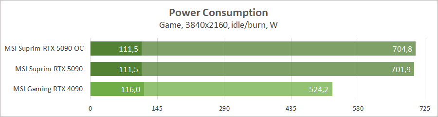 Температура GPU находилась на уровне 64,2 °C, а памяти — 66 градусов, скорость вентиляторов равнялась 1580 об/мин. Показатели самой горячей зоны теперь недоступны, видимо, чтобы не шокировать пользователей, тем более если посмотреть на потребление карты, которое достигало целых 617 ватт! Ох, не тот керогаз господин Хуанг вытащил из духовки, ох не тот, с этим было бы эффектнее…
