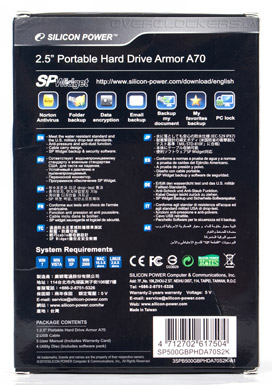 Большую часть лицевой стороны занимает прозрачное окно, через которое можно в подробностях рассмотреть внешний жесткий диск. На обратной стороне можно найти описание защитных свойств и комплектного ПО SP Widget, которое предназначено для автоматического резервирования и шифрования данных, а также использования внешнего накопителя в качестве смарт-ключа для блокирования ПК. В тестировании принимала участие модель емкостью 500 Гбайт, кроме того существуют модификации объемом 320 и 640 Гбайт.