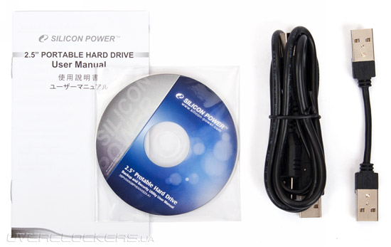 Судя по логотипу, нанесенному на лицевую сторону коробки, жесткий диск Silicon Power Armor A70 без особого труда способен выдержать столкновение с субмариной. Мы не рекомендуем повторять данный эксперимент, так как последствия от такого инцидента для судна могут быть весьма печальными. Комплект поставки накопителя включает интерфейсный Y-образный кабель, который следует использовать при недостаточной мощности портов USB, диск с программным обеспечением и руководство пользователя.