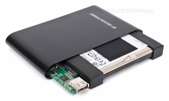 Внутри портативного накопителя Silicon Power Armor A70 установлен «ноутбучный» жесткий диск Hitachi Travelstar 5K500.B (HTS545050B9A300), вмещающий 500 Гбайт информации. Этот HDD имеет интерфейс SATA 3 Гбит/с, частоту вращения магнитных пластин 5400 об/мин и оснащается кэш-памятью объемом 8 Мбайт. Для преобразования протокола SATA в USB 2.0 используется чип-переходник Initio INIC-1607P производства компании Silicon Technology Co., Ltd. Это надежное и отлаженное решение повсеместно применяется во многих портативных накопителях самых разных вендоров.