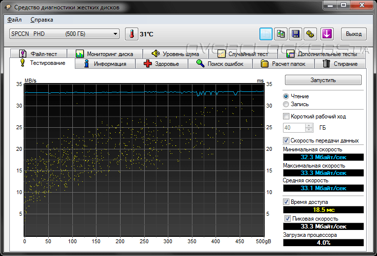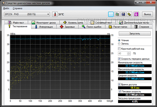 Несмотря на использование весьма быстрого жесткого диска, но медленной шины USB 2.0 для подключения к ПК, результаты линейного чтения получились совершенно ожидаемыми и составили максимально 33 Мбайт/с, что говорит о неполном использовании потенциала HDD Hitachi Travelstar 5K500.B.