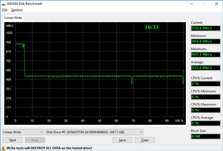 Поддерживаемый Kingston A1000 480GB SLC-режим при непрерывной записи смог принять чуть более 7 Гбайт, после чего скорость записи снижается до отметки в 523 Мбайт/с. Учитывая использование чипов памяти TLC NAND, это хороший результат.