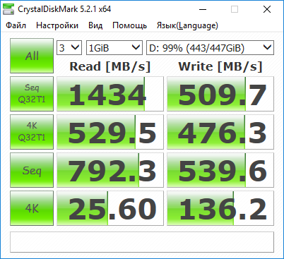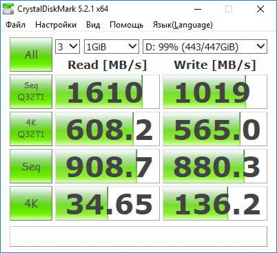 Результаты CrystalDiskMark также продемонстрировали высокую (но не рекордную) скорость работы Kingston A1000 480GB с 4К-блоками.
