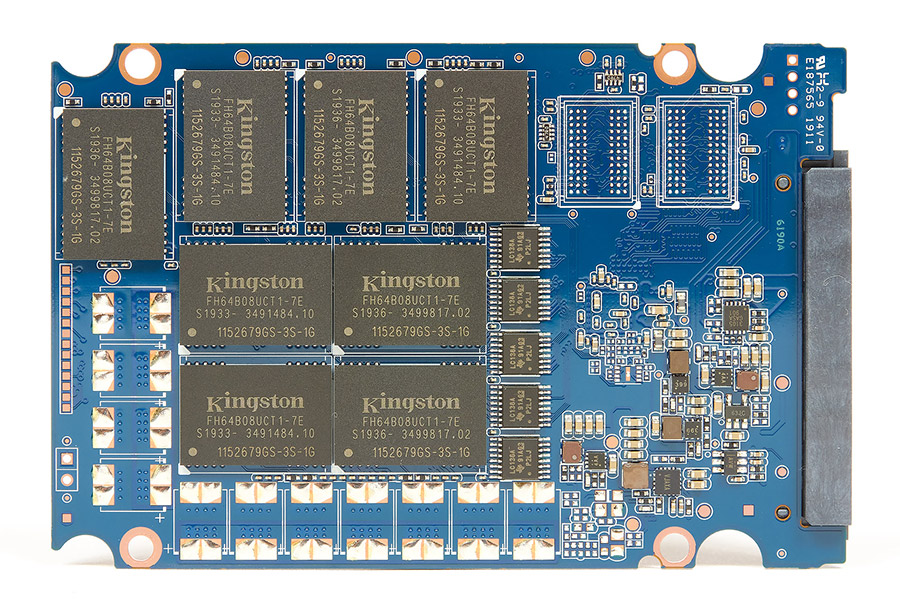 Используется пространство по обе стороны текстолита. Также есть посадочные места для танталовых конденсаторов и двух банок DRAM. Первые используются в старших накопителях серии для защиты от случайной потери питания или его перепадов, например DC500R, а DRAM-кэш наращивается в зависимости от объема.
