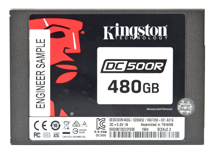 Нам достались инженерные образцы накопителей, потому оценить качество и комплект их упаковки возможности нет. DC500R имеет металлический корпус, окрашенный в серый цвет. Вся основная информация о нем помещена на фирменную наклейку в лицевой части. Дополнительно справа нанесена круглая гарантийная пломба, хотя в розничных вариантах она может быть расположена и в другом месте.