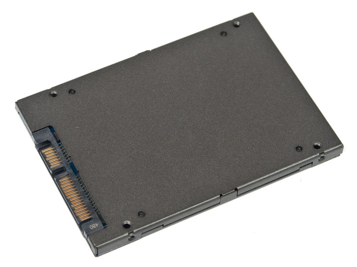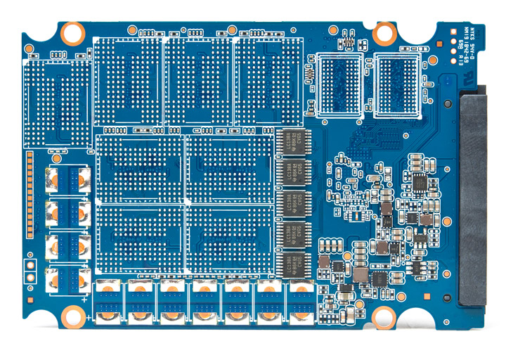 Полноформатная печатная плата выглядит очень насыщенной компонентами. Кроме стандартных для SSD элементов тут привлекают внимание пять танталовых конденсаторов, призванных помочь сохранить данные в случае перепадов напряжения или внезапного отключения энергии. Еще шесть мест под них остались не распаянными и, очевидно, зарезервированы для дисков большей емкости.