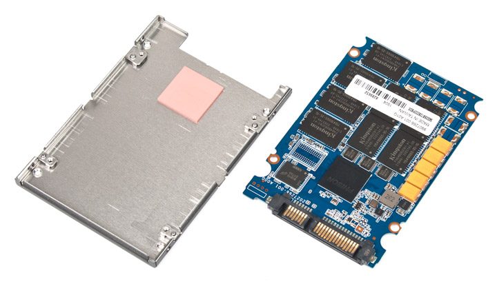 А вот нижняя крышка хоть и не окрашена, зато имеет мягкую термопрокладку, которая хорошо отводит тепло от контроллера памяти.