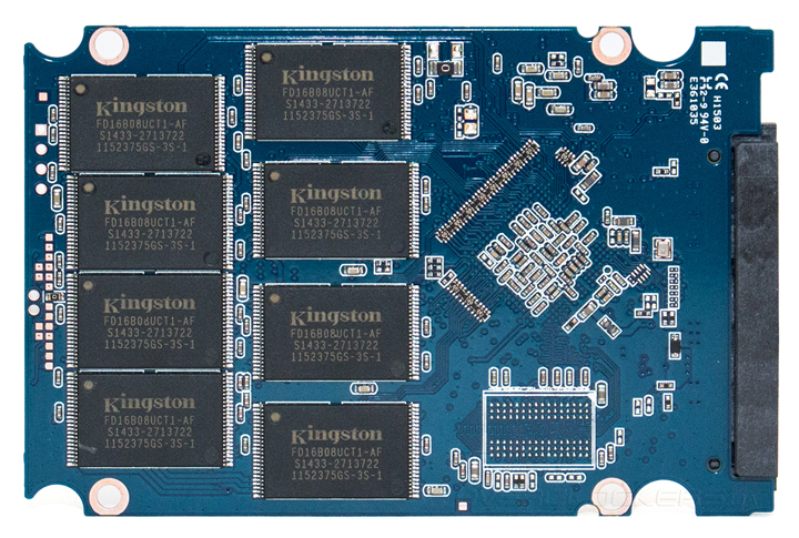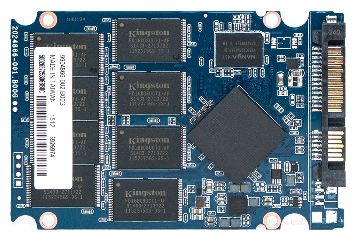 Внутри корпуса находится печатная плата с 16 микросхемами флэш-памяти, симметрично распаянными с каждой ее стороны. Хотя чипы памяти промаркированы как Kingston FD16B08UCT1-AF, на самом деле перед нами довольно популярная 19-нанометровая память MLC NAND от Toshiba. Дополняет набор компонентов контроллер Phison PS3110-S10 и буфер DRAM DDR3 от Nanya, объемом 256 Мбайт и с тактовой частотой в 1600 МГц.