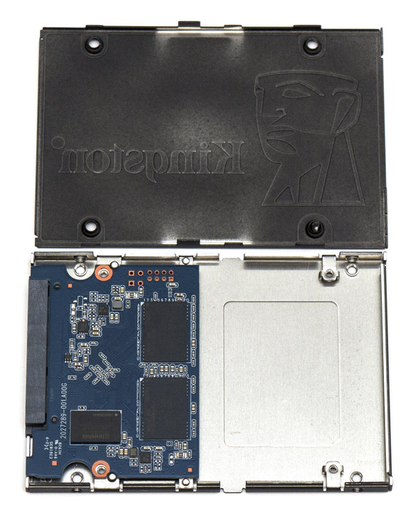 Точные габариты корпуса устройства составляют 100,1x69,85x7 мм, что соответствует форм-фактору в 2,5-дюйма. Сам корпус выполнен из металлического сплава. Новая цветовая схема, с преобладающим черным цветом и серебристым логотипом компании-производителя, пришла на смену серебристо-черной окраске, которая использовалась во многих SSD от Kingston на протяжении нескольких последних лет.