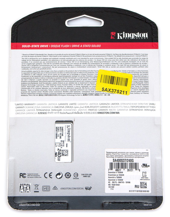 Герой обзора поставляется в блистере средних размеров. На лицевой стороне упаковки размещена информация о преимуществе в скорости работы относительно классических HDD, указана точная ёмкость модели и добавлено упоминание о трёхлетней ограниченной гарантии. Какие-либо дополнительные аксессуары в комплекте поставки отсутствуют. Важно также отметить, что со второго квартала 2017 года все SSD-накопители Kingston и HyperX, предназначенные для отечественного рынка и официально ввезенные на территорию Украины, будут маркироваться специальной голографической наклейкой с серийным номером на упаковке. Только такие накопители могут претендовать на гарантийное обслуживание у нас в стране. SSD-накопители, купленные на Amazon, E-Bay или в других странах, в Украине гарантийной замене не подлежат, но подлежат гарантийной замене у продавца или через один из RMA-хабов компании в Великобритании, США или на Тайване. Отправку гарантийного накопителя оплачивает покупатель, так что стоит дважды подумать, прежде чем экономить несколько гривен на покупке неофициального накопителя.