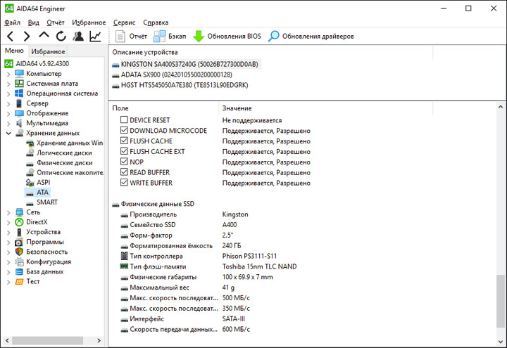 Что касается контроллера, то в конкретном образце SA400S37/240G установлен переименованный микропроцессор Phison PS3111-S11, который является урезанной версией Phison PS3110-S10. Используемый чип лишился поддержки внешнего буфера, получив взамен встроенный на незначительные 32 Мбайта, оперирует всего одним ARM-ядром и способен работать максимум в двуканальном режиме.