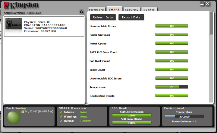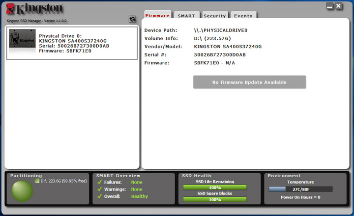 Функционал фирменного приложения Kingston SSD Manager располагает базовыми операциями, которые могут потребоваться пользователю, и сводится к анализу состояния устройства, проверке доступных обновлений микрокода, обнулению диска посредством выполнения команды Secure Erase и мониторингу гарантийного ресурса SSD Life Remainig.