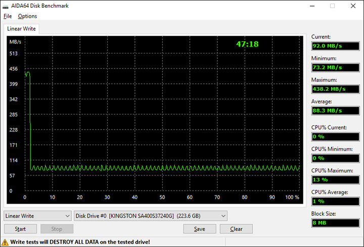 Объем SLC-буфера SSDNow A400 240GB составляет немногим более двух гигабайт, после чего наблюдается снижение скорость работы до 73–90 Мбайт/с.
