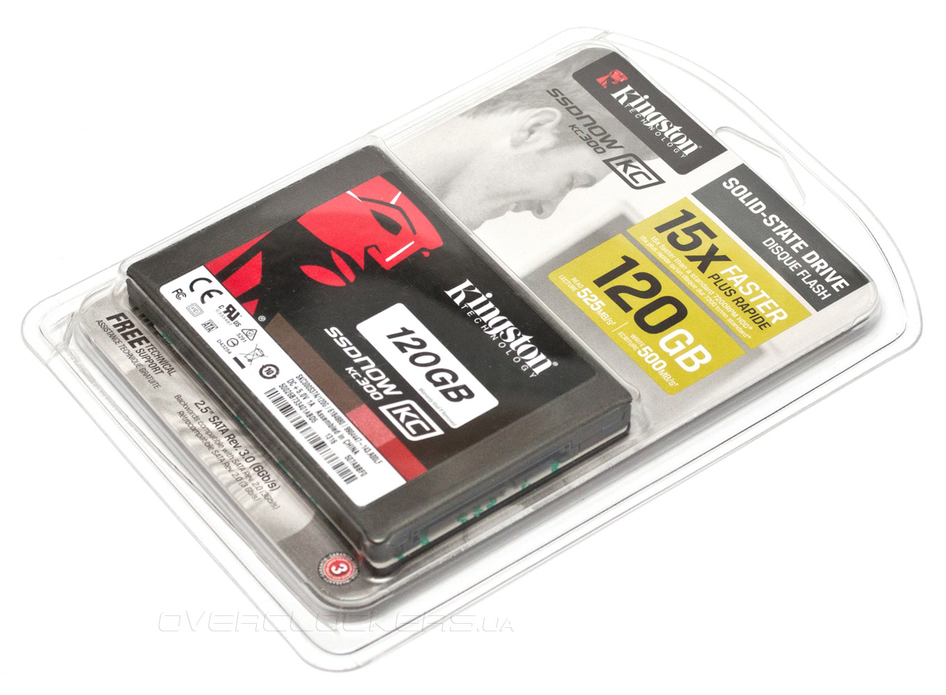 В розничные сети Kingston SSDNow KC300 поступают в двух комплектах поставки: стандартном и расширенном, который включает внешний «карман» с интерфейсом USB, шасси для установки в отсек 3,5″, кабель SATA и диск с ПО для миграции данных. Попавший в тестовую лабораторию накопитель имеет стандартную комплектацию, в прозрачном пластиковом блистере кроме самого SSD обнаружилась только рамка-переходник с клейкой основой.