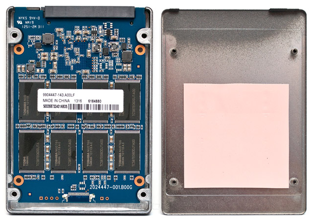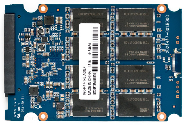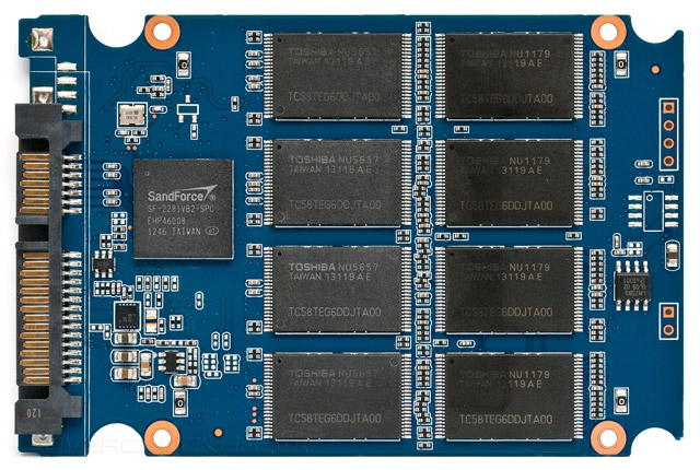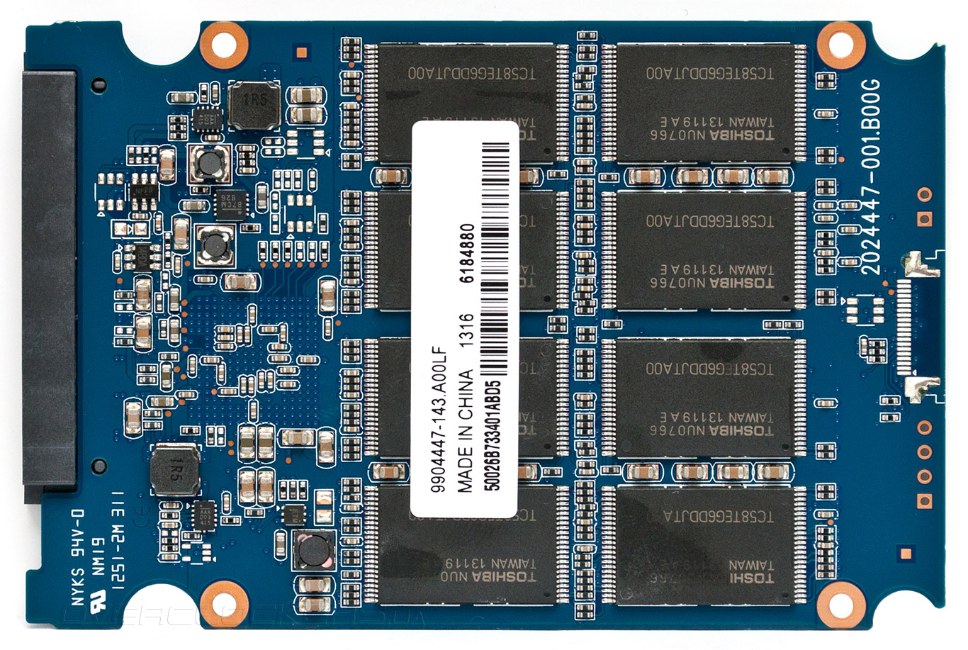 Банк памяти набран 16 микросхемами MLC NAND емкостью 8 ГБ каждая, что в сумме дает 128 ГБ. Из них 8 ГБ зарезервированы для работы технологии RAISE и подменного фонда ячеек памяти, а пользователям доступно 120 ГБ. На чипы нанесена маркировка TC58TEG6DDJTA00, говорящая, что чипы произведены Toshiba по 19-нм технологии, работают в режиме Toggle Mode, а их ключевой особенностью является размер страниц 16К вместо обычных 4К. Большое количество чипов памяти позволяет задействовать все восемь каналов контроллера SF-2281, что дает надежды на неплохой уровень быстродействия.