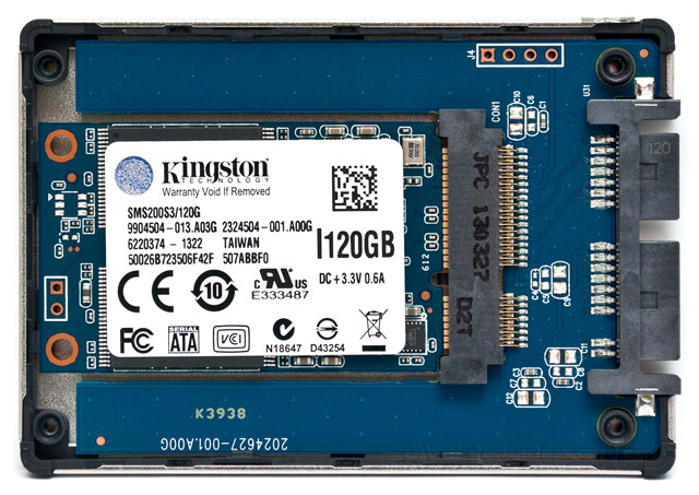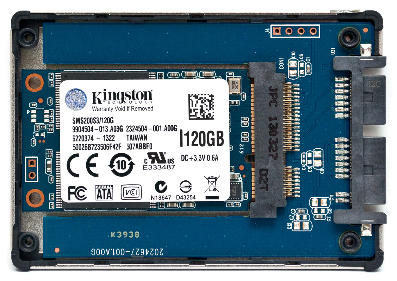 При изучении SSDNow KC380 120GB нас ждал настоящий сюрприз, внутри корпуса оказалась плата-переходник, в которую установлен… твердотельный накопитель Kingston SMS200S3/120G с разъемом mSATA. Запоминающее устройство оказалось приклеенным к корпусу, в следствие чего подробности об использованной элементной базе пришлось черпать из открытых источников.