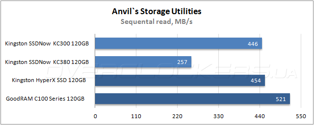 При тестировании мы учитываем, что твердотельные накопители в процессе эксплуатации подвержены эффекту «деградации» производительности, которое выражается в падении скорости записи. Это связанно с особенностями взаимодействием контроллера и флэш-памяти, но больше других от деградации страдают SSD, построенные на базе контроллеров SandForce второго поколения. Несмотря на поддержку TRIM такие устройства не восстанавливают скорость записи до первоначального состояния, поэтому, максимальную производительности они демонстрируют весьма непродолжительное время. Для измерения скоростных показателей мы решили отказаться от применения Crystal Disk Mark в пользу синтетического бенчмарка Anvil's Storage Utilities, который предлагает больший набор тестовых сценариев, характерных для различных типов нагрузки на подсистему хранения данных.