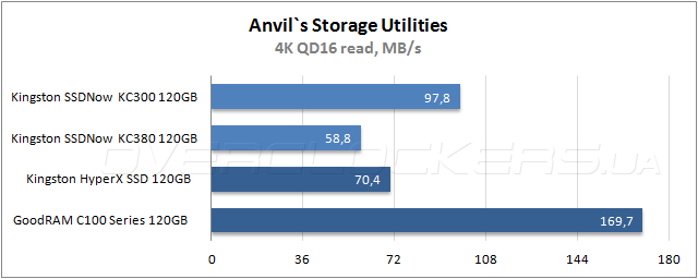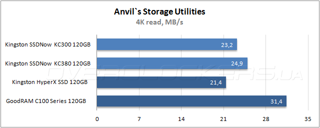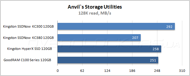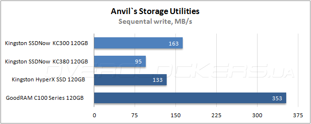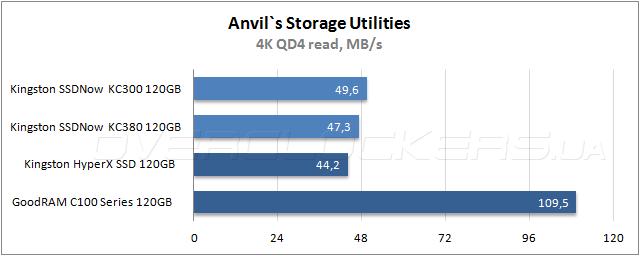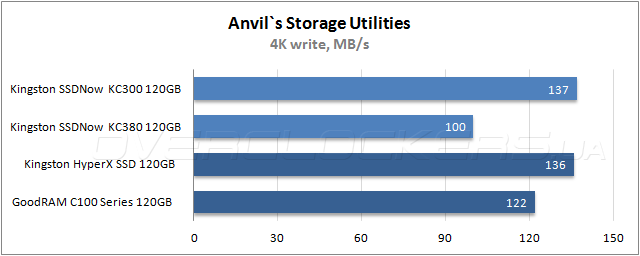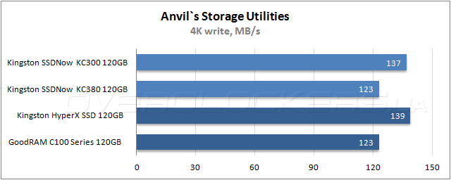 И снова первое место поделили Kingston KC300 и GoodRAM C100, причем, минимальное преимущество последнего укладывается в погрешность измерения, тогда как при оценке среднего быстродействия его превосходство оказалось более заметным. Последнее место, ожидаемо досталось КС380, а «пожилой» Kingston HyperX расположился точно посередине между своими собратьями.