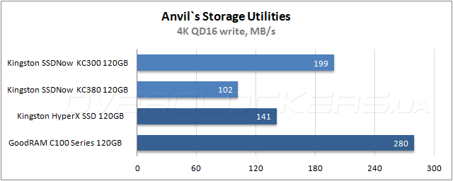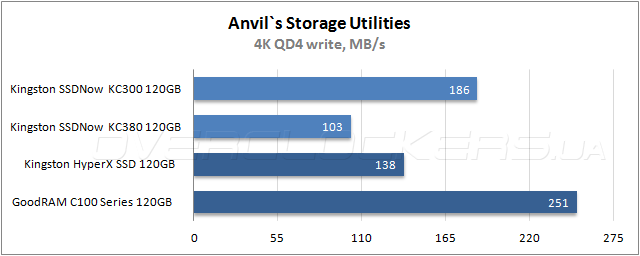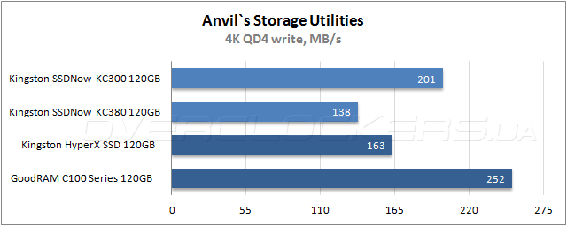 В подтесте последовательной записи Kingston KC300 выступил очень убедительно, заметно опередив Kingston HyperX, но даже это не позволило ему приблизиться к результатам GoodRAM C100. Зато, при случайной записи файлов 4К накопители, основанные на SandForce, лидируют, и даже Kingston КС380 показал результаты на уровне накопителя GoodRAM. Однако, формирование очереди команд на запись вывело в лидеры SSD на базе контроллера Phison, а второе место достается Kingston КС300, причем, его преимущество над двумя другими участниками оказалось весьма заметным. На этом фоне результаты SSDNow KC380 120GB совсем не радуют, ограничение возможностей контроллера негативно сказалось на его производительности.