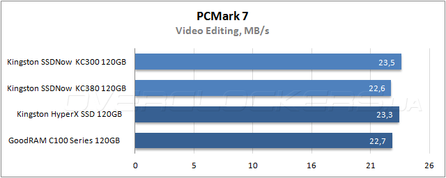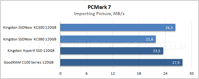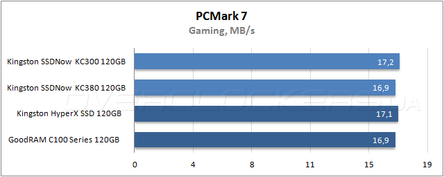 Для оценки быстродействия SSD при выполнении типичных повседневных задач мы использовали подтест Storage suite из состава бенчмарка Futuremark PCMark 7.